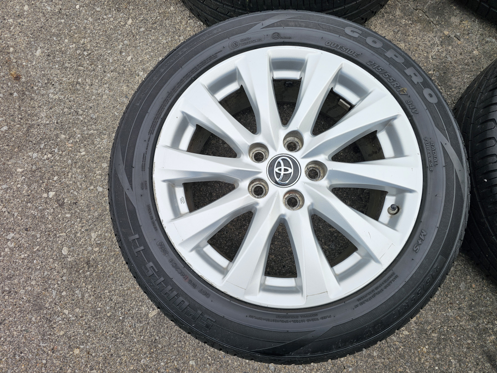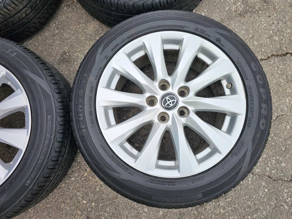 Set of 4 original 17" Toyota camry rims with all season tires on them 215/55/R17. Rims and tires are in good shape, no issues. Tires are almost brand new with approximately 90% thread left on them. TPMS INSTALLED