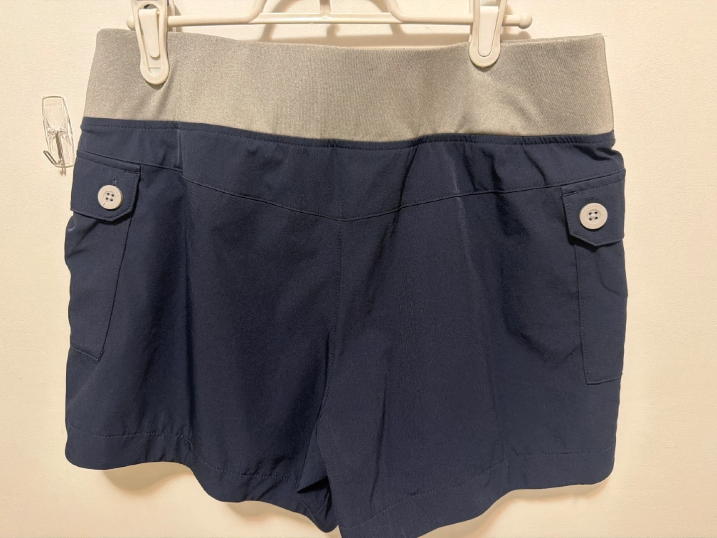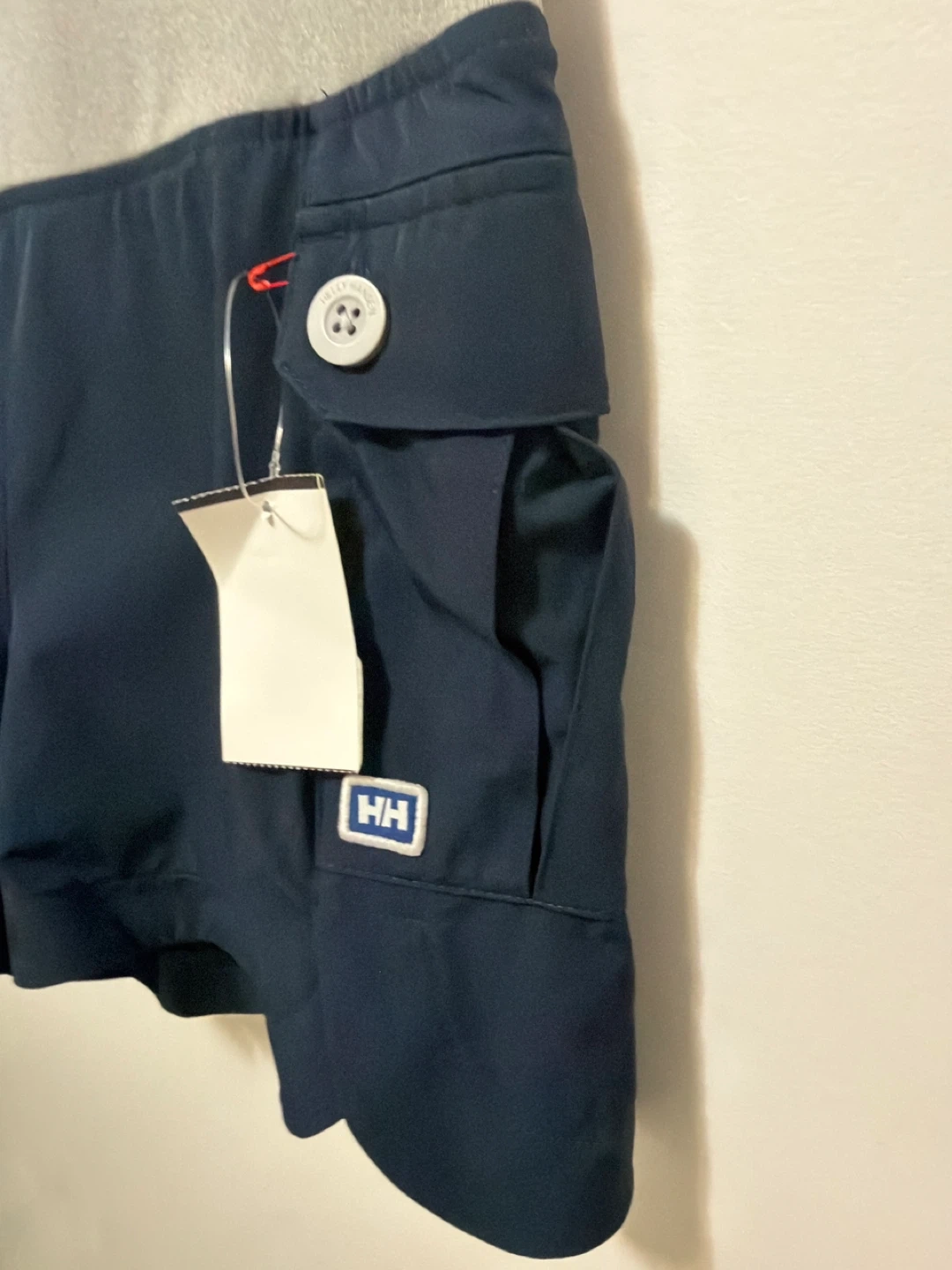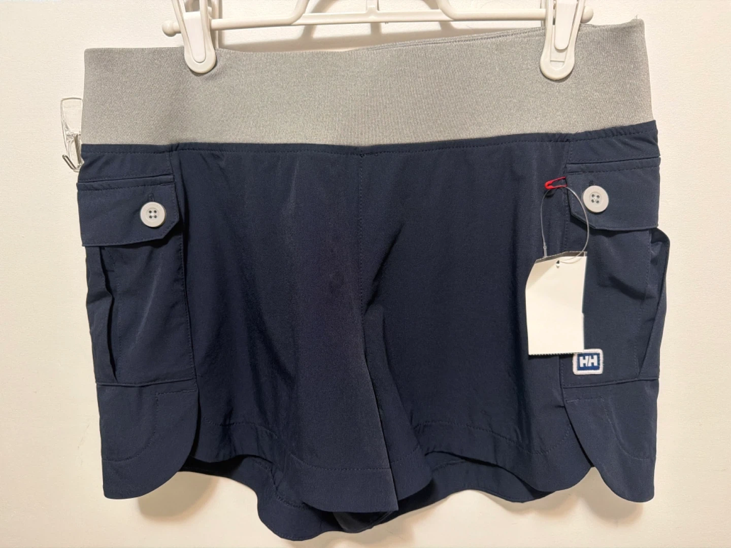 Helly Hansen women's shorts in navy. Size M/regular. Designed and developed in Norway since 1877. These shorts feature a grey elastic waistband and button-closure cargo pockets. These are brand new with tag.