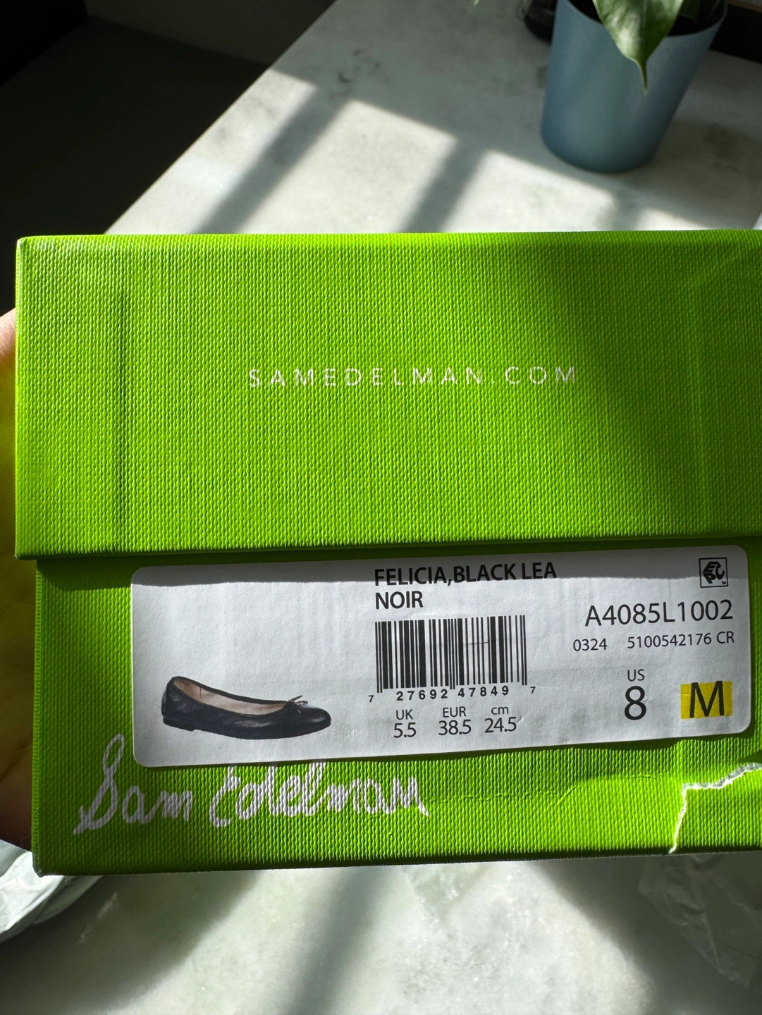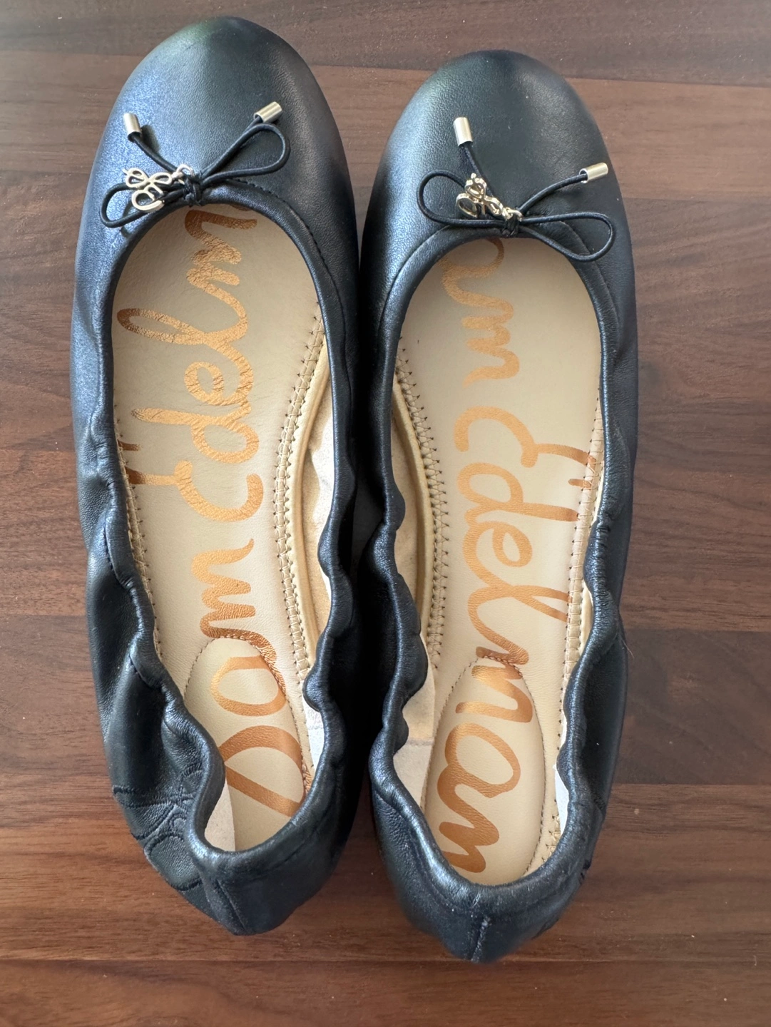 Women's black leather ballerina flats. Size 8. Sam Edelman brand. Bow detail on toes. Excellent condition. Comes in original box.