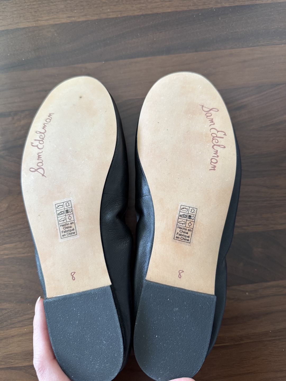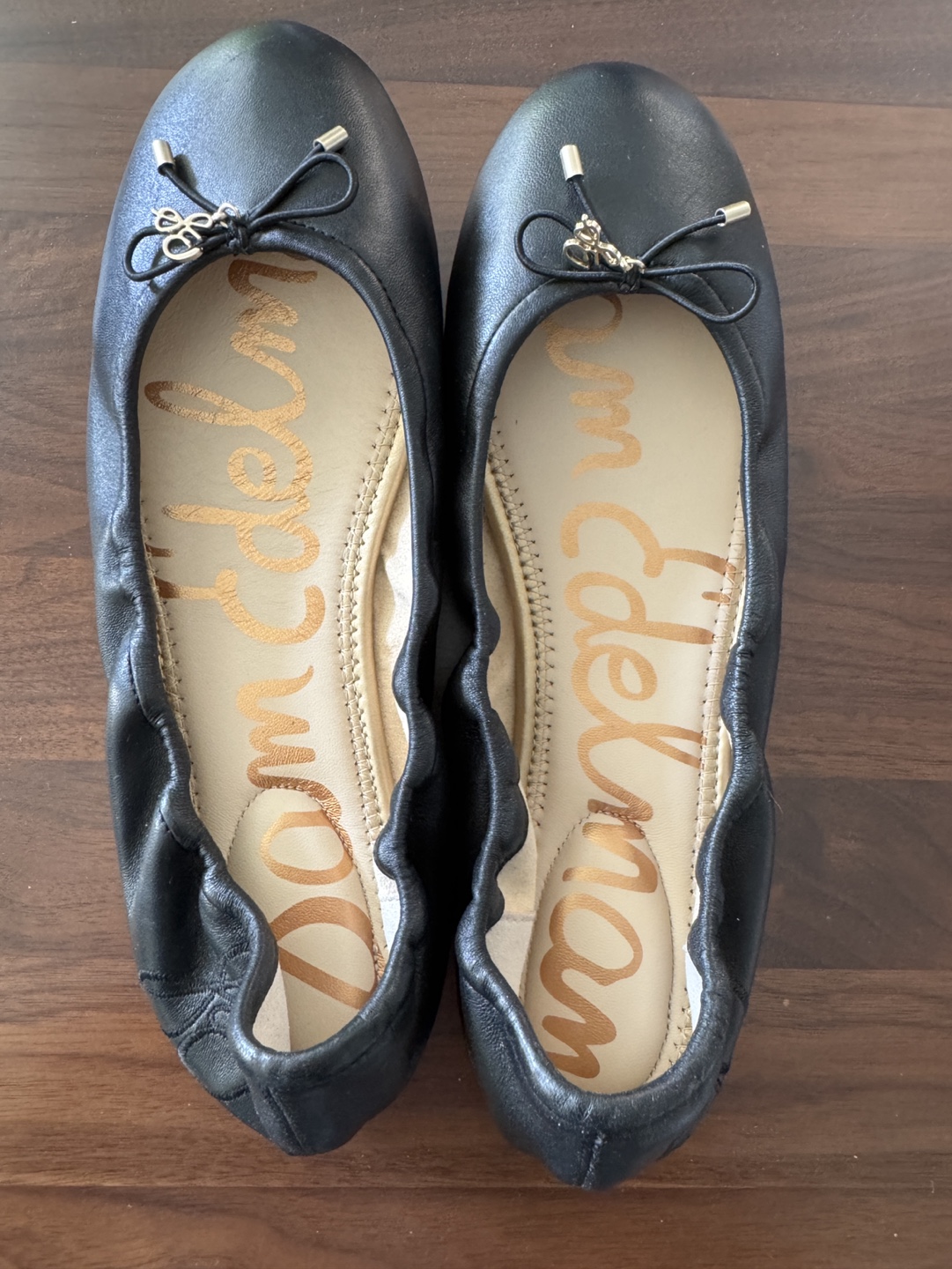Women's black leather ballerina flats. Size 8. Sam Edelman brand. Bow detail on toes. Excellent condition. Comes in original box.