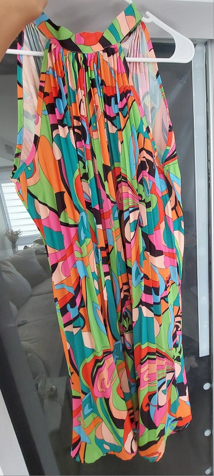 This vibrant dress features a fun and eye-catching pattern! It's made with a pleated design that adds a unique texture and flow. Perfect for adding a pop of colour to your wardrobe!