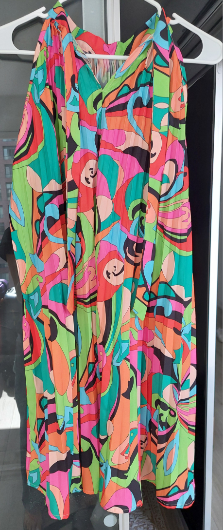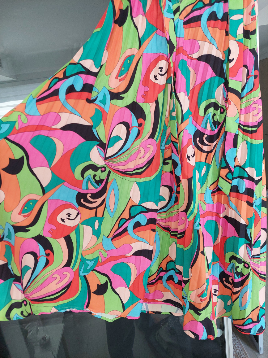 This vibrant dress features a fun and eye-catching pattern! It's made with a pleated design that adds a unique texture and flow. Perfect for adding a pop of colour to your wardrobe!