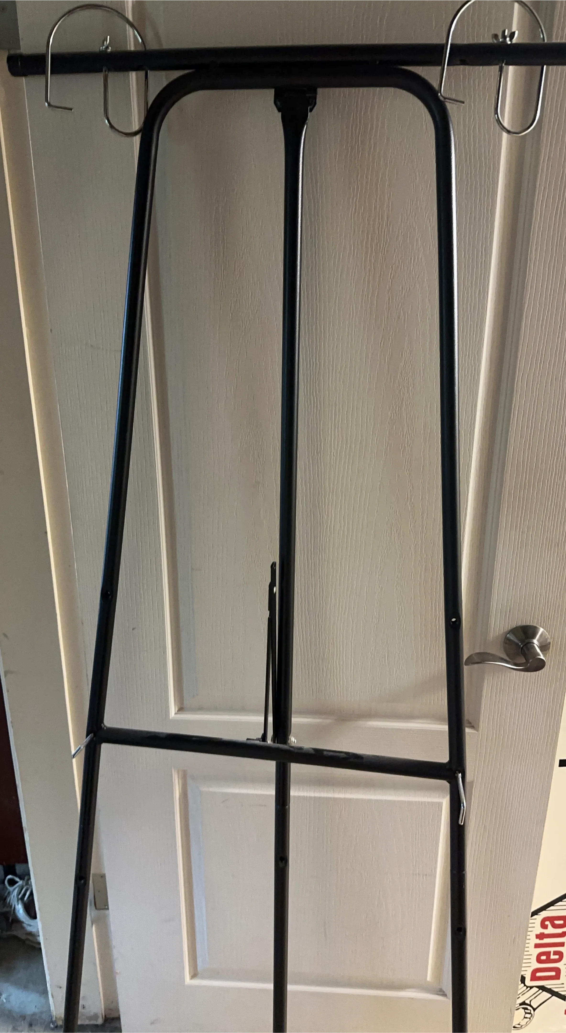A black metal easel stand. It's adjustable and can be used for art displays or presentations. The stand is made of durable metal.