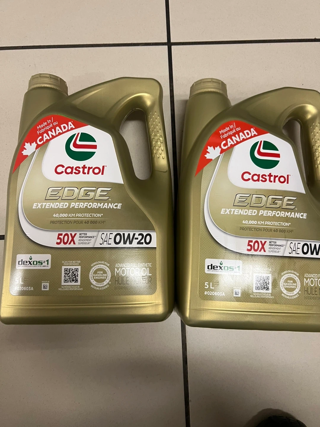 Two 5L bottles of Castrol EDGE Extended Performance SAE 0W-20 motor oil. Made in Canada. Offers 40,000 KM protection. This is advanced full synthetic motor oil.