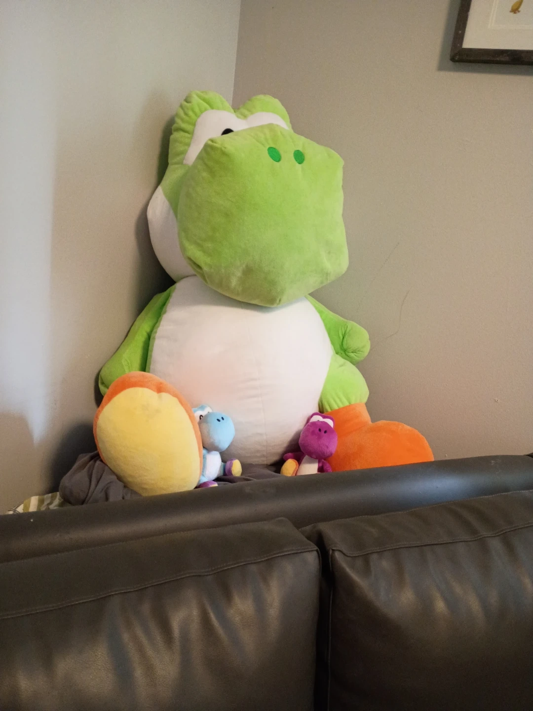 This is a large, soft plush toy of Yoshi. It's green with a white belly and has a very friendly expression. It's big enough to lean against and would be a fun addition for any Nintendo fan!