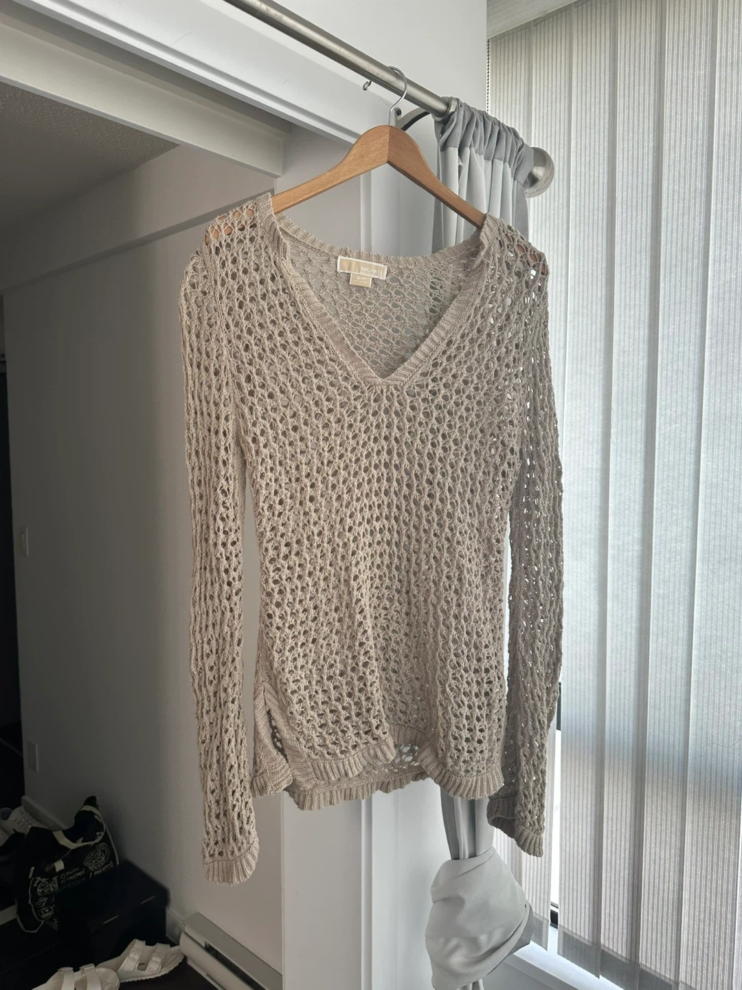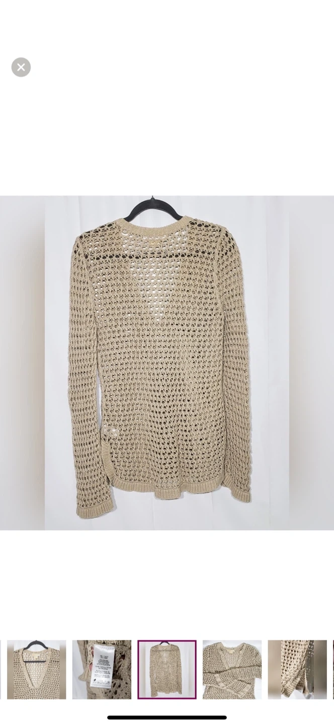 A beige knit V-neck sweater from Michael Kors. It's a long-sleeved, open-knit design. This piece is great for layering over swimwear or casual tops.