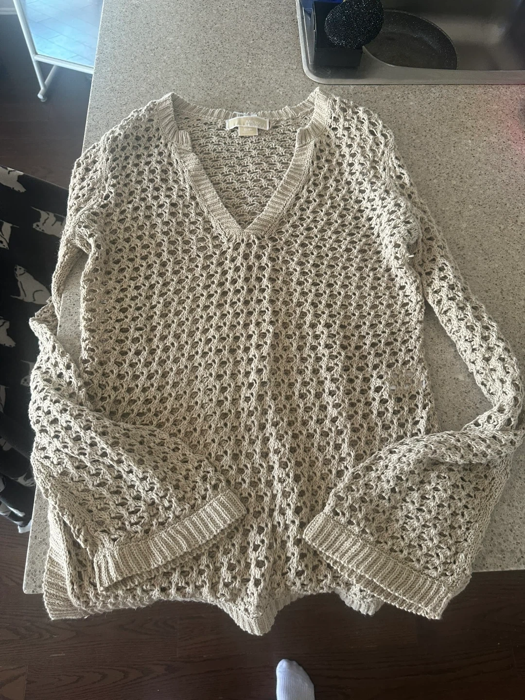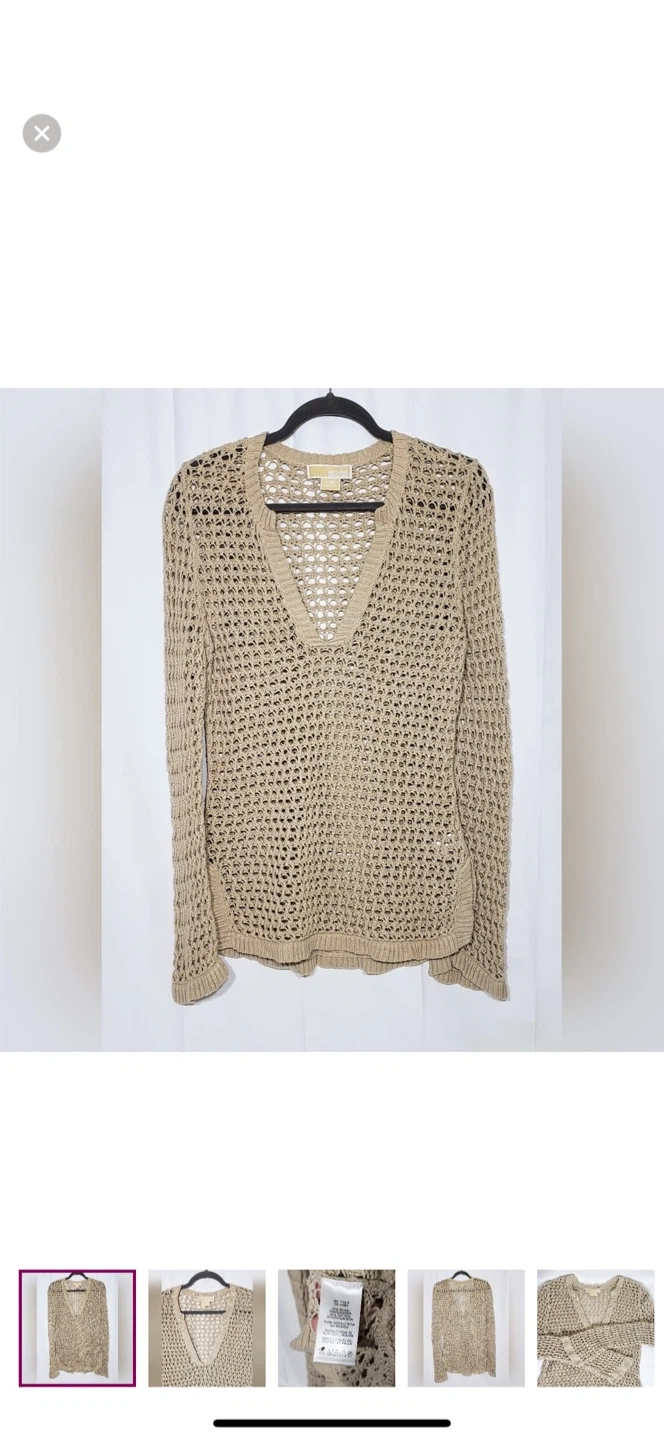 A beige knit V-neck sweater from Michael Kors. It's a long-sleeved, open-knit design. This piece is great for layering over swimwear or casual tops.