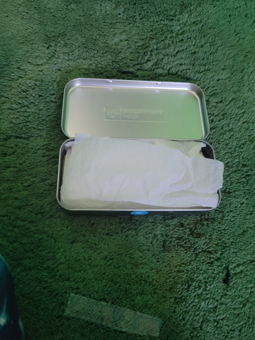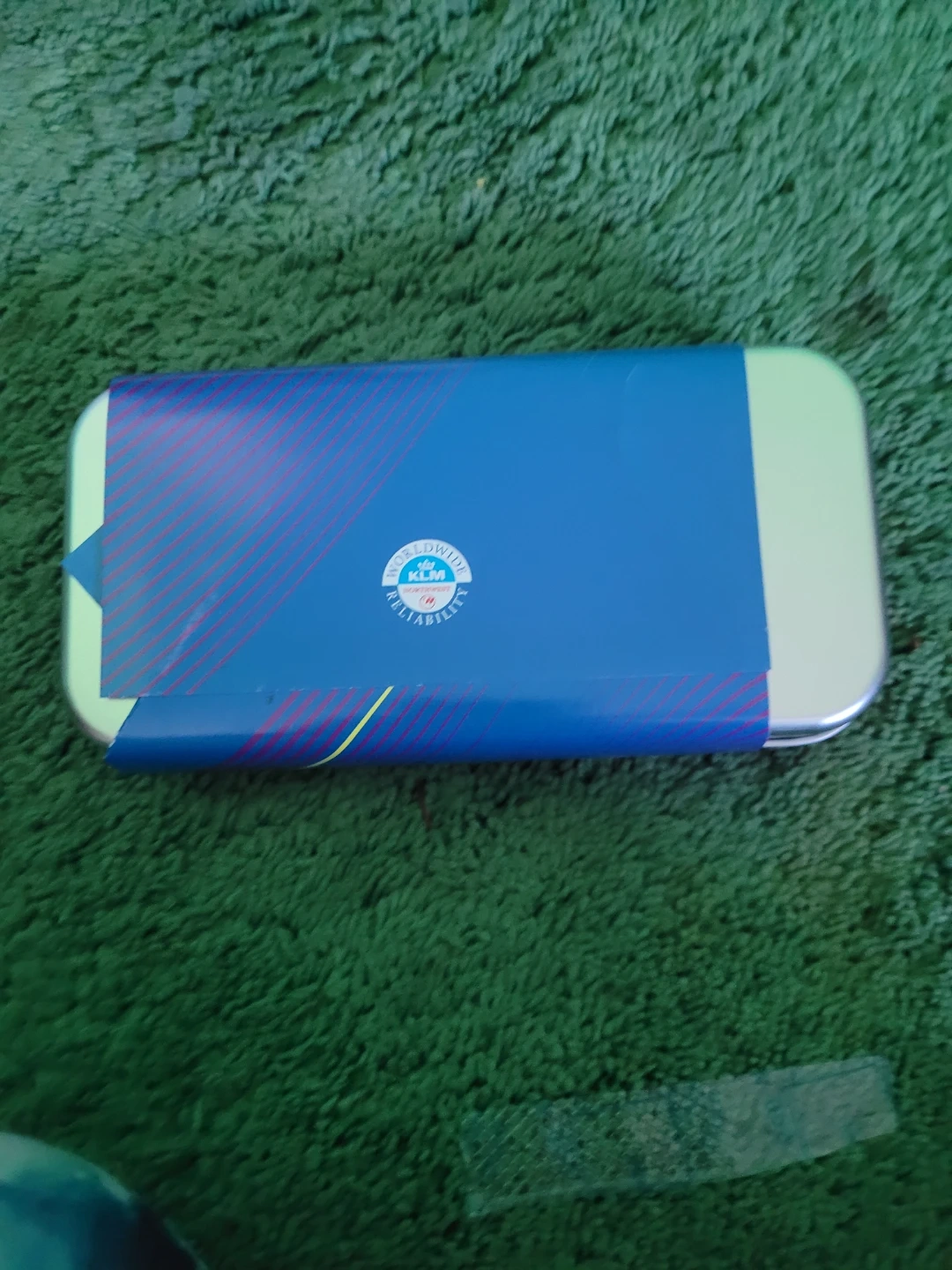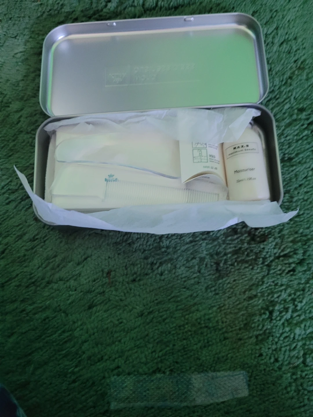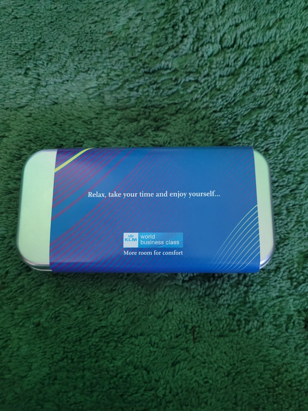 This KLM Business Class travel amenity kit comes in a reusable tin. It contains toiletries like moisturiser and other personal care items. Great for long flights!