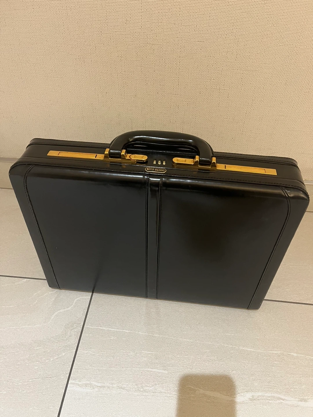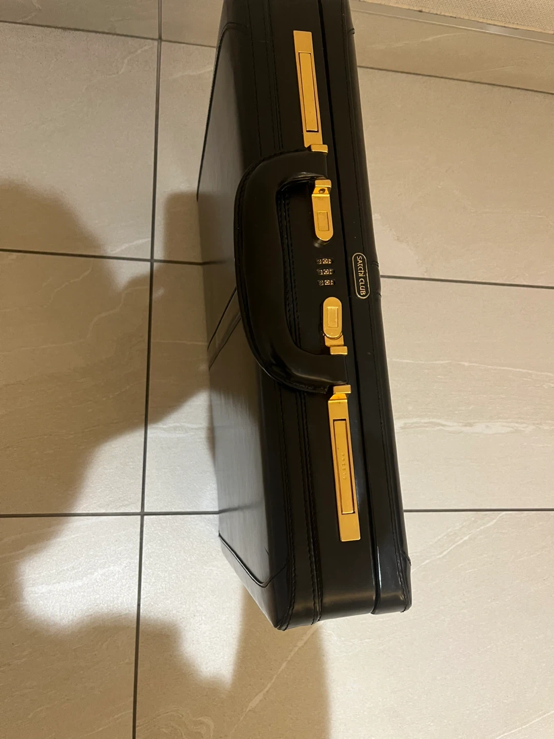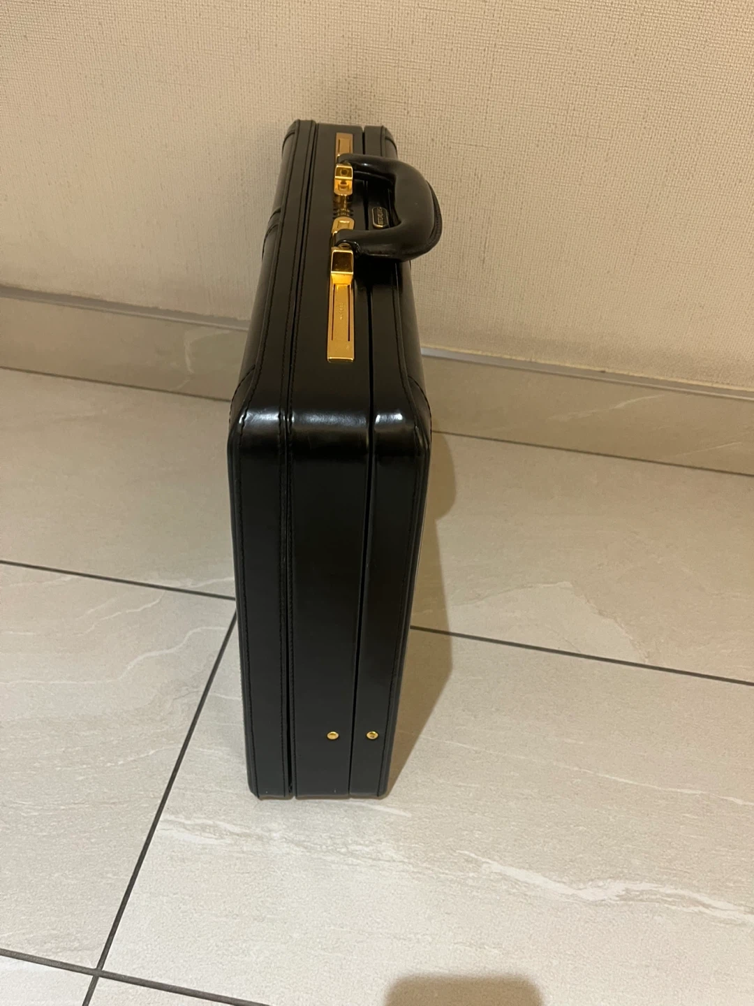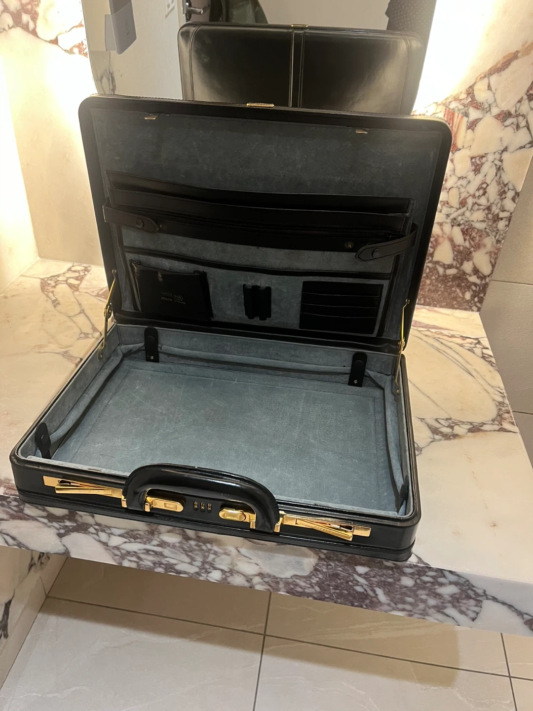 Classic black leather briefcase from Satchi Club. Features a three-digit combination lock and gold-tone hardware. Interior has multiple compartments for organization. It's perfect for professionals needing to carry documents and a laptop.