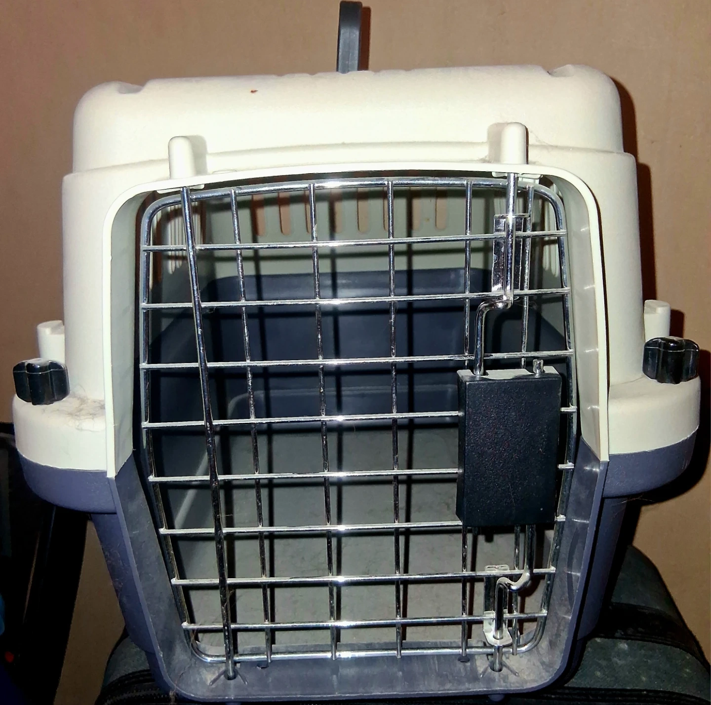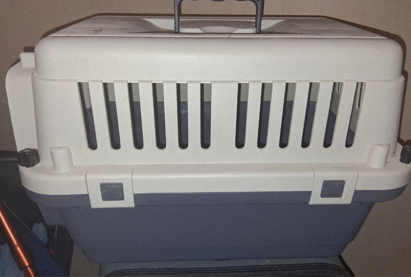 This is a standard plastic pet carrier with a metal door. It's a neutral grey and white colour. The dimensions are suitable for smaller pets. It's great for trips to the vet or travel! Pickup Only unless near intersection of Oxford and Gammage Street.