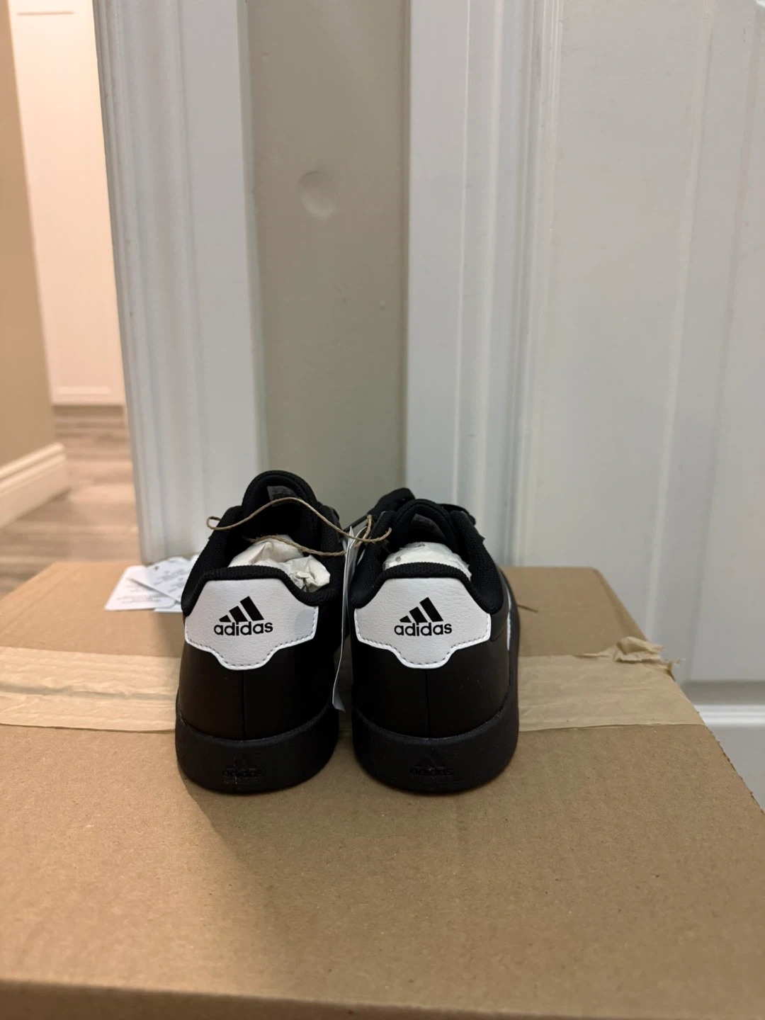 Classic Adidas sneakers in black with iconic white stripes. These shoes are comfortable for everyday wear. Synthetic leather upper.