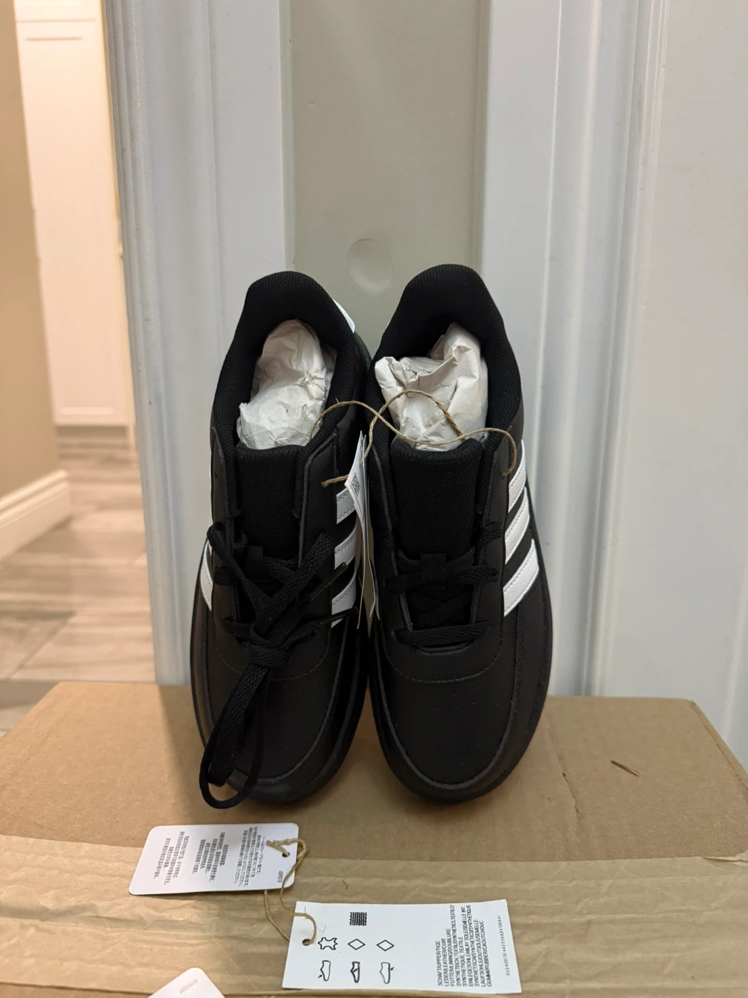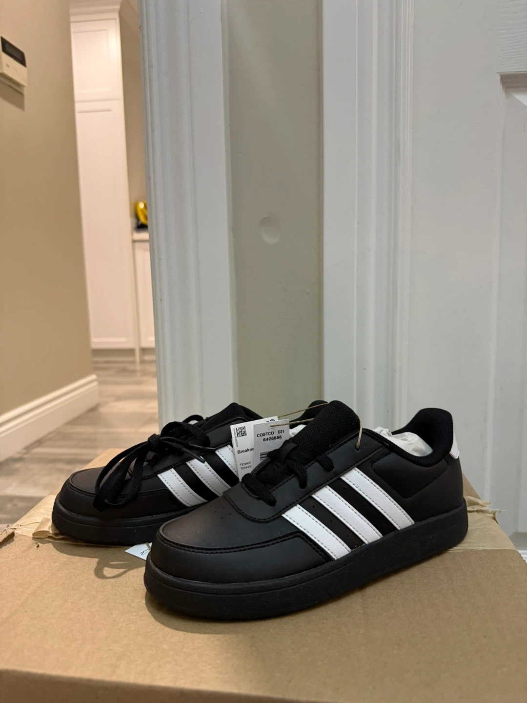 Classic Adidas sneakers in black with iconic white stripes. These shoes are comfortable for everyday wear. Synthetic leather upper.