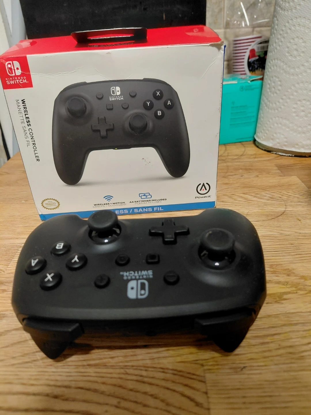 This is a black PowerA wireless controller for Nintendo Switch. It includes motion controls and AA batteries. Works wirelessly.