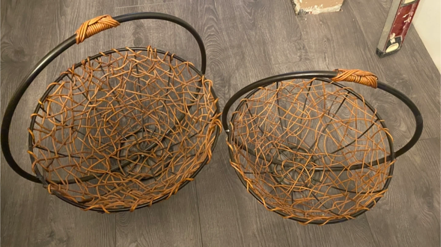 These two decorative baskets feature a metal frame with woven wicker accents. They're perfect for storage or display. Wicker and metal construction.