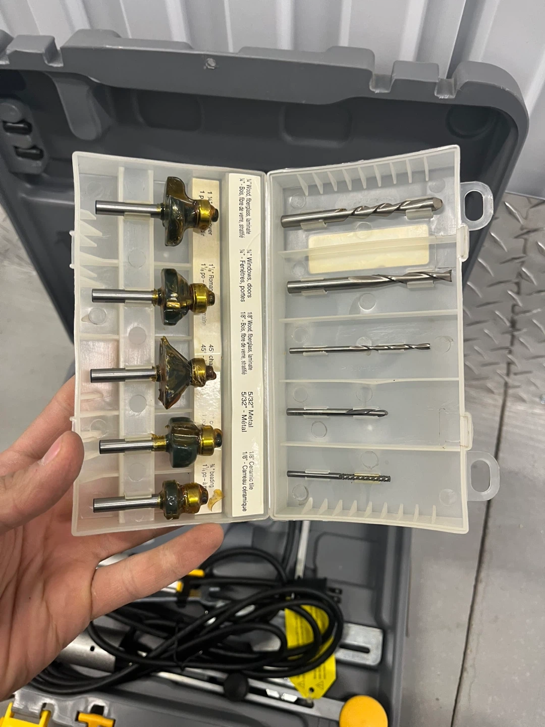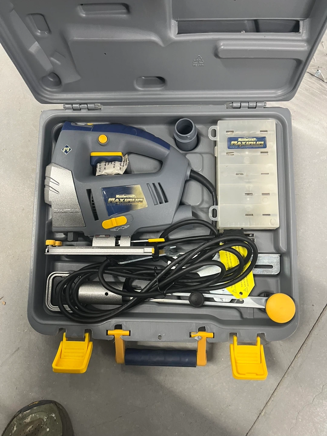 This Mastercraft Maximum serpentine saw comes with a set of router bits. It's in a durable grey carrying case with yellow latches and a blue handle. Includes various drill bits and router bits for different woodworking tasks.