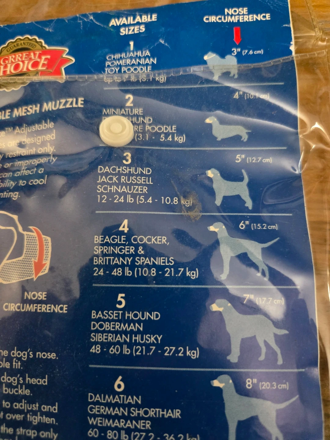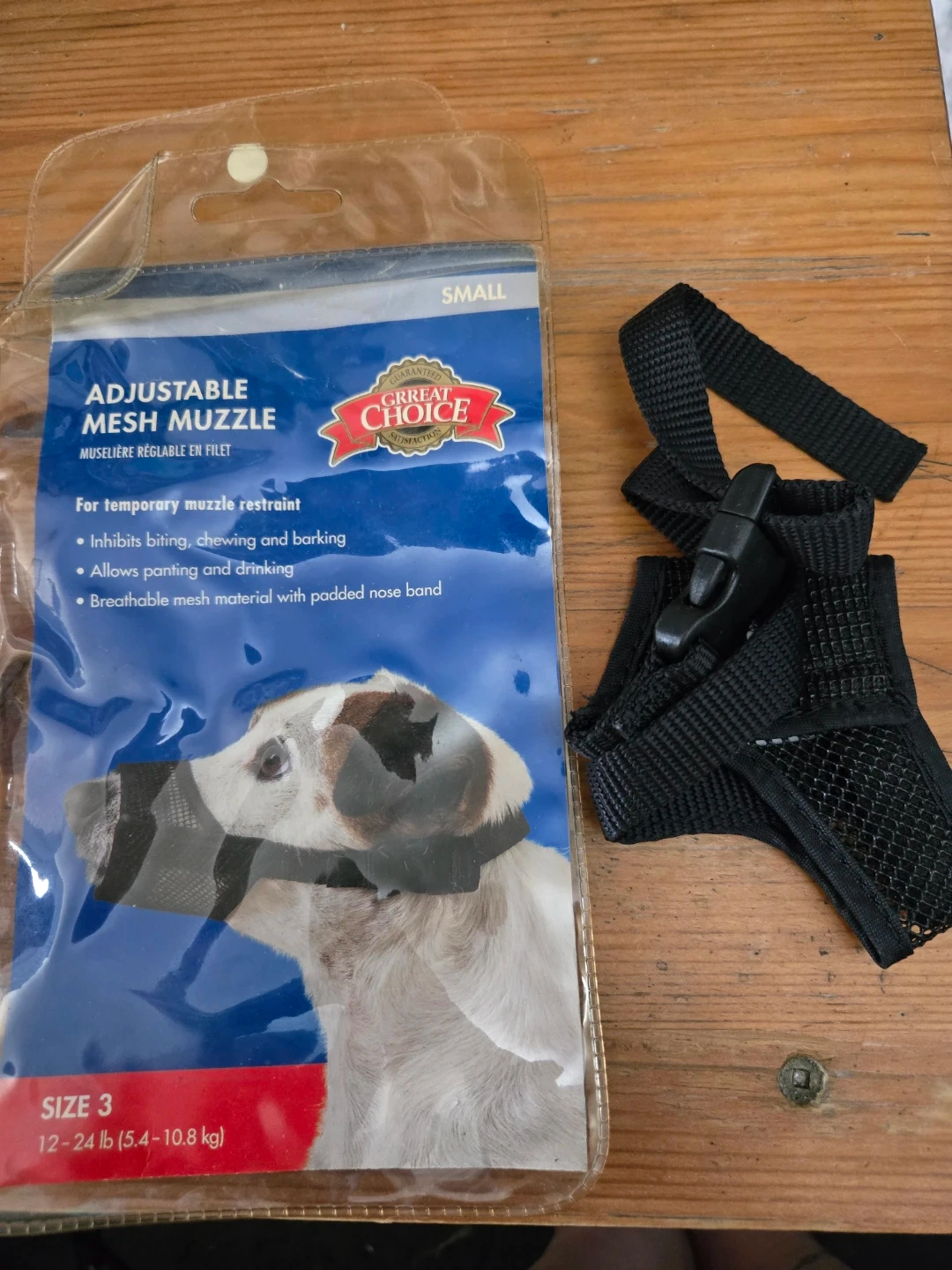 This is a Great Choice adjustable mesh muzzle, size 3. It's suitable for dogs weighing 12-24 lbs (5.4-10.8 kg). It inhibits biting, chewing, and barking while allowing panting and drinking