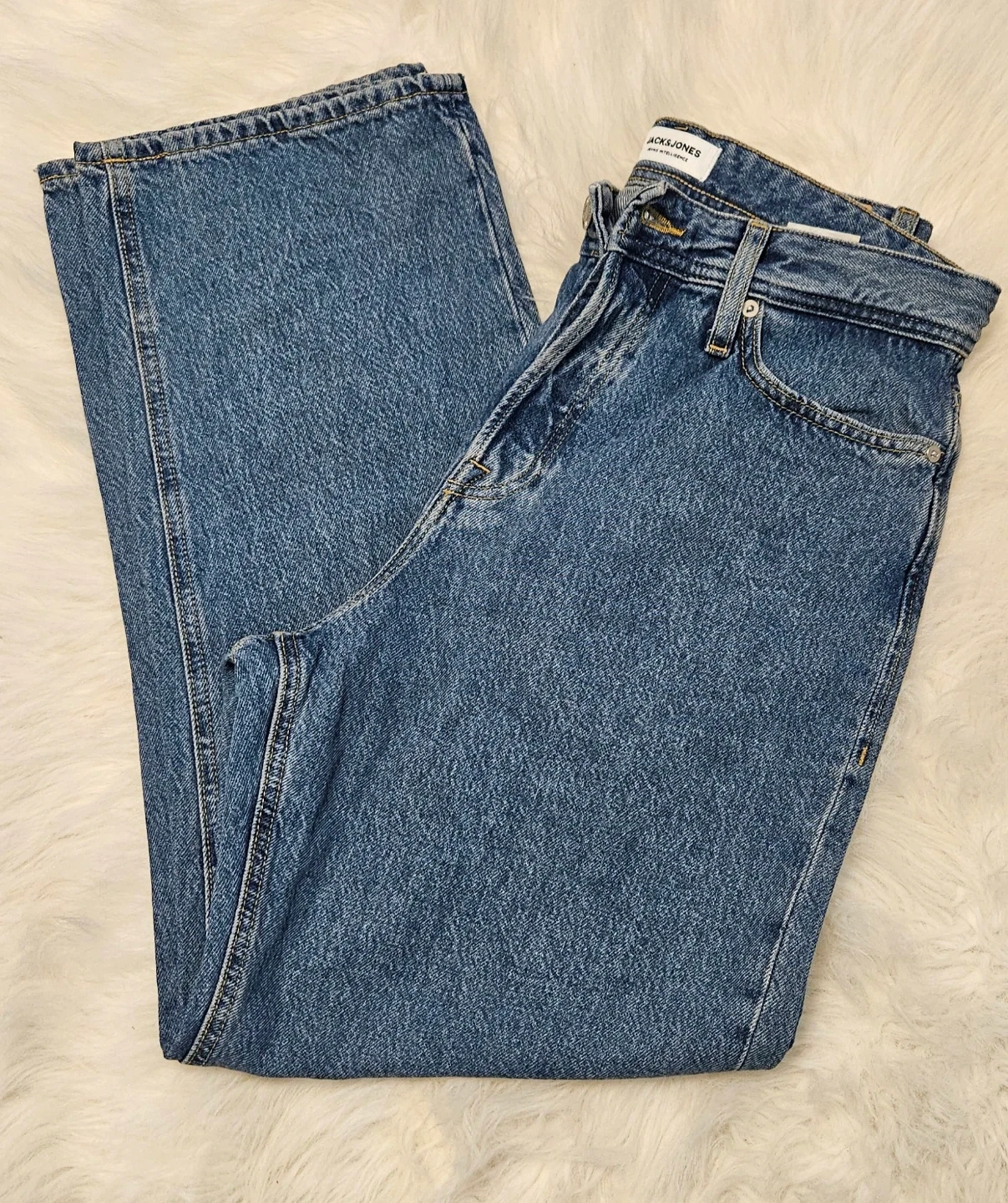 These are JACK & JONES Baggy Alex jeans in a medium blue wash. Cotton denim construction with a relaxed fit. Perfect for casual everyday wear! A high rise/loose thigh wide knee/loose leg opening.