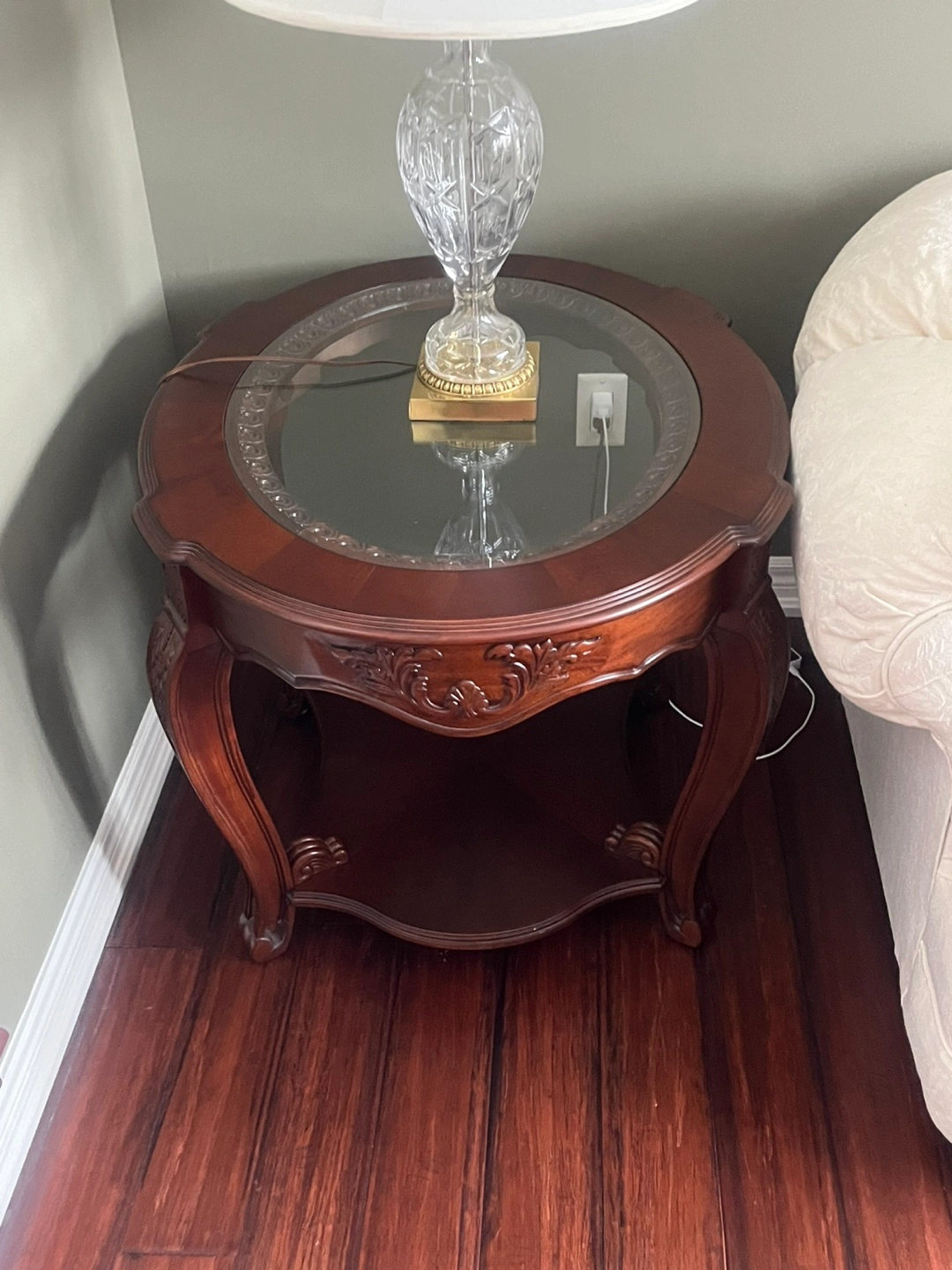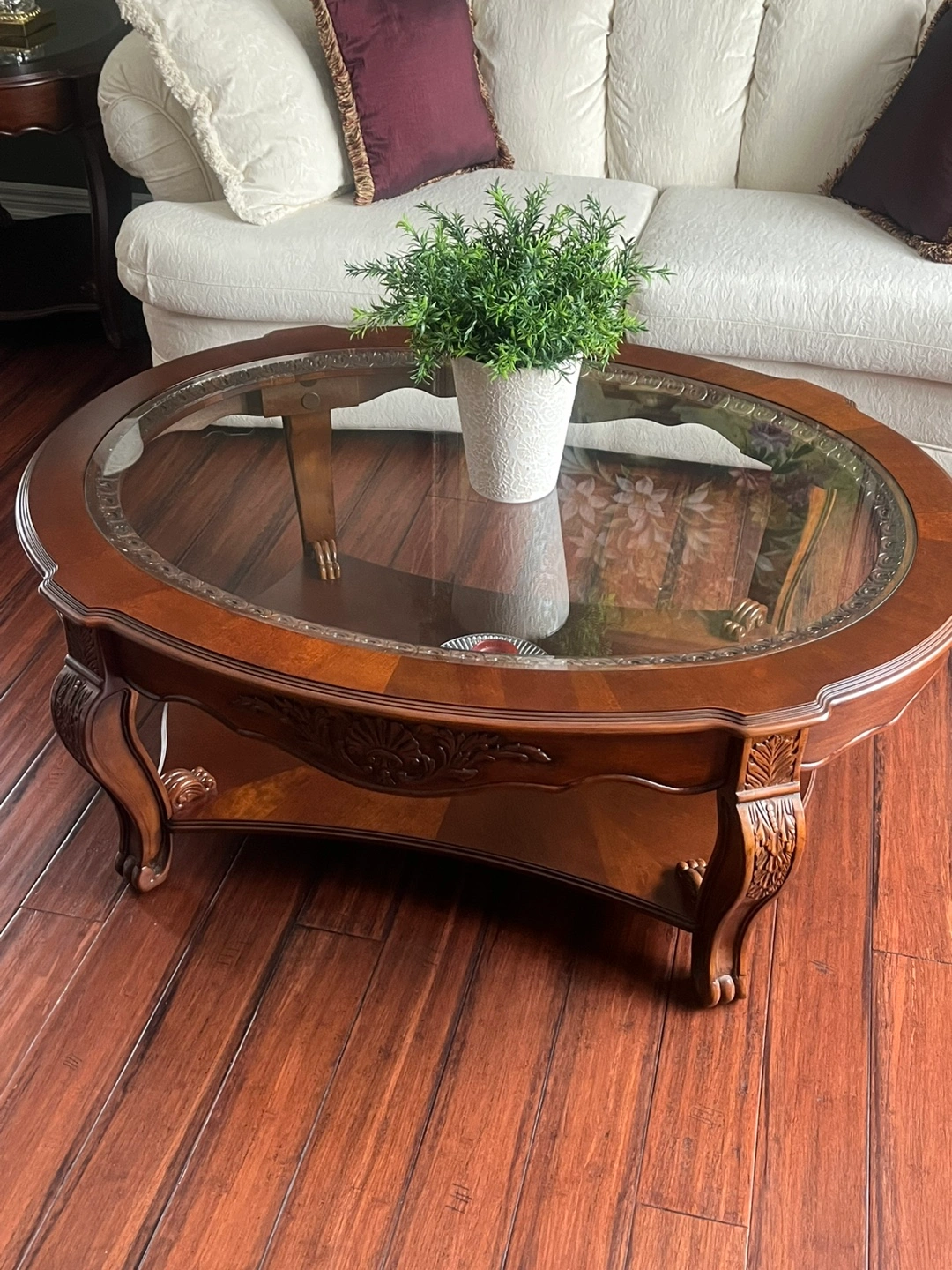 Beautiful matching set. Includes coffee table, , and end table. Dark wood finish. Ornate carvings. Glass tops. Excellent condition. Perfect for a living room. Mahogany smoke free.