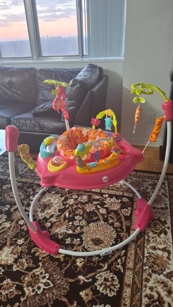 I'm selling a baby jumperoo in great condition! It's a fun and safe way for your little one to bounce and play. The jumperoo features a variety of colorful toys and activities to keep your baby entertained. Recommended age range is for babies who can hold their head up unassisted. It's in good shape and ready for a new home!