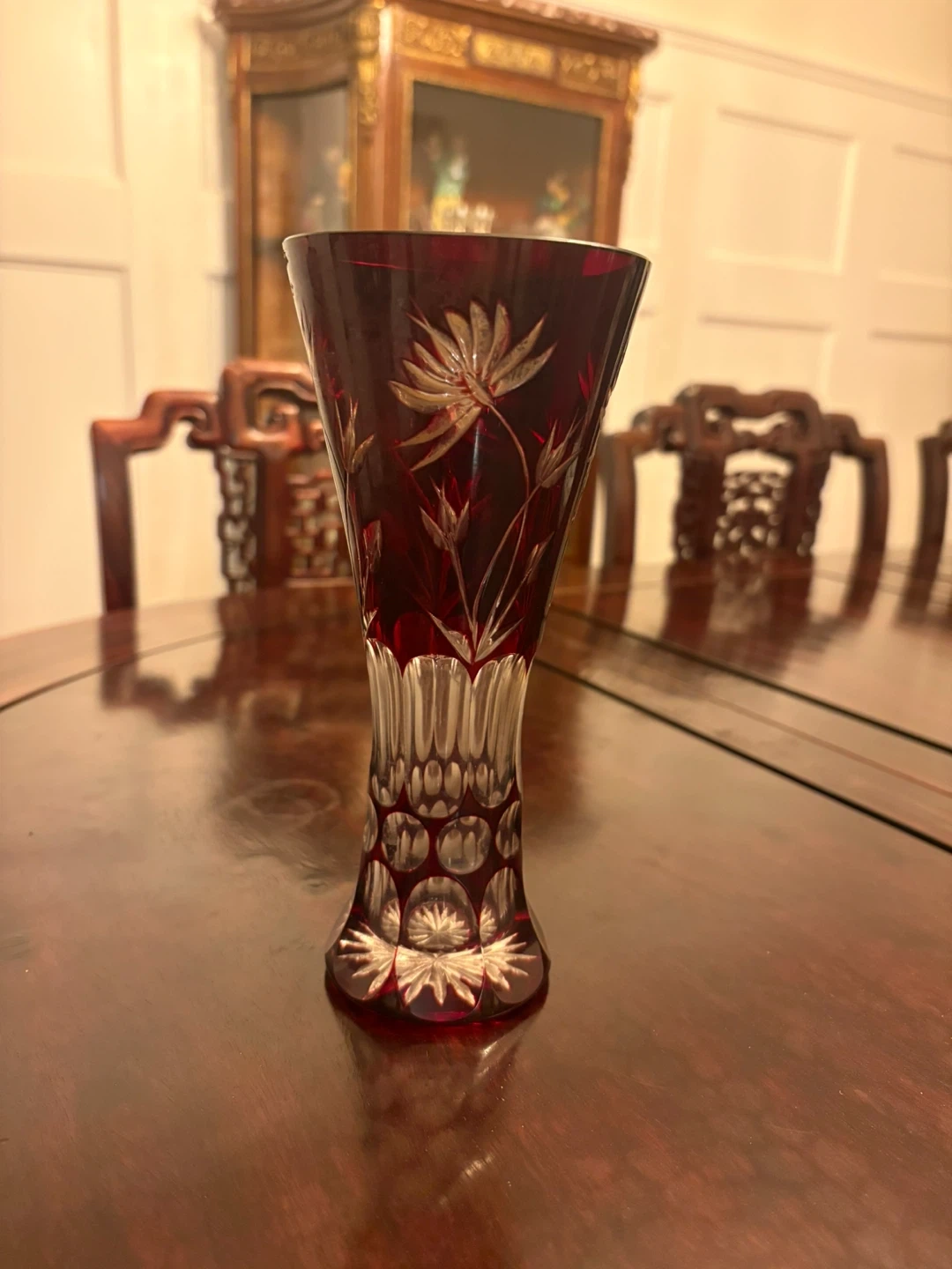 Beautiful deep red crystal vase with intricate etched floral designs. It's a real statement piece for any room. The base features a classic hobnail pattern and cut details.