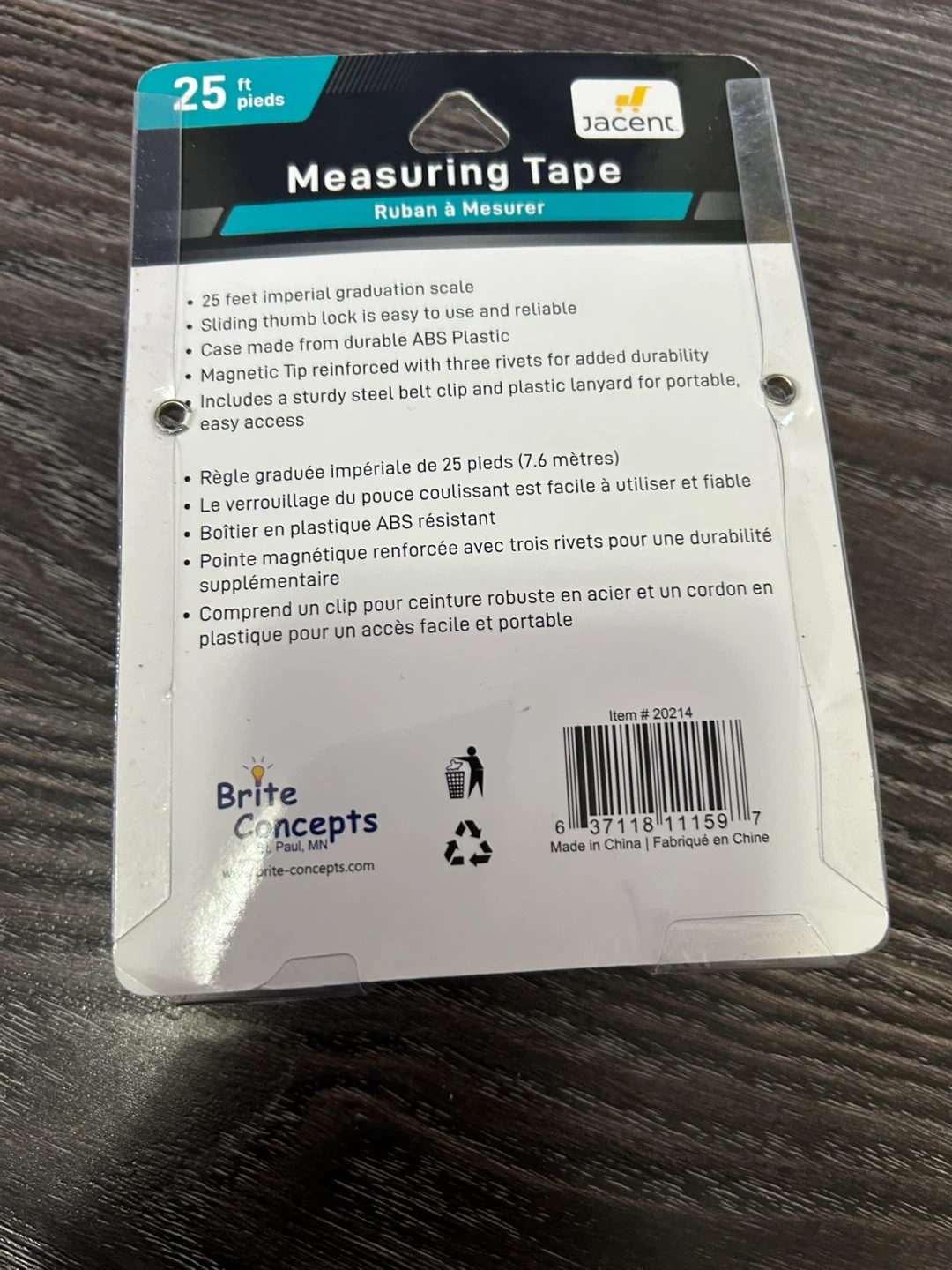 25 foot measuring tape. Never been opened. Made by brite concepts. Includes steel belt clip and plastic lanyard for portable easy access. No refunds. Cash or e-transfer only. Payment to be made at pick up. Pick up place is A&W on 200st Langley