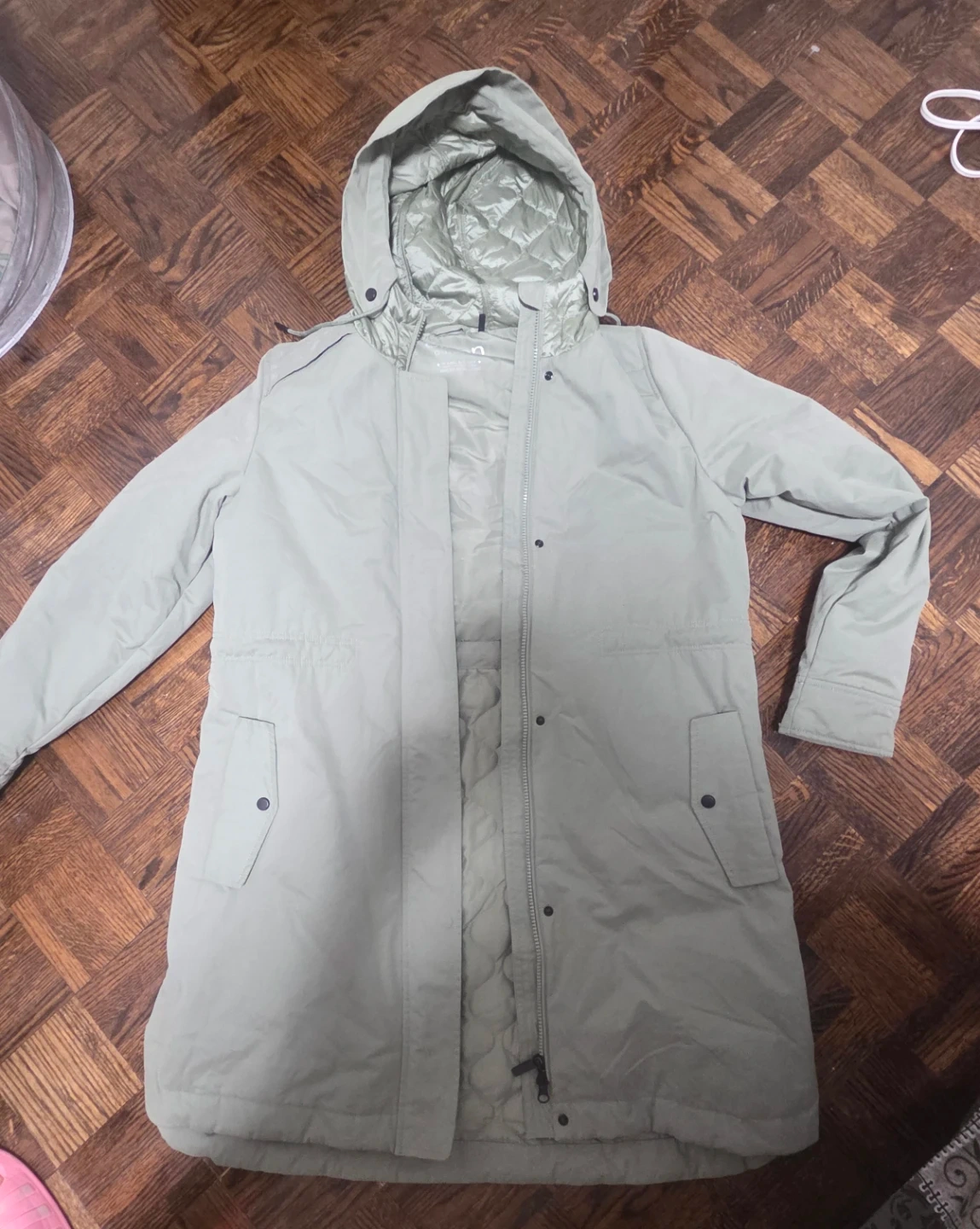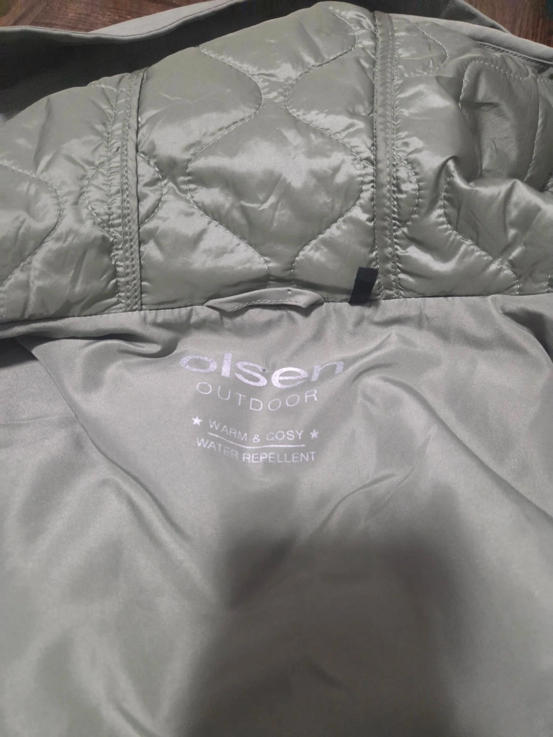 I'm selling an Olsen Outdoor jacket that's perfect for staying warm and cosy! It's water repellent, so you'll be protected from the elements. This jacket is great for outdoor activities or just running errands around town