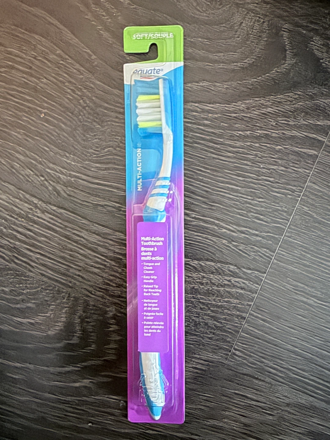 I'm selling an Equate multi-action soft toothbrush. It features an easy grip handle for comfort and control. The tight zig zag with raised tip bristles help to clean between teeth and along the gumline. It also has a flexible neck for gentle cleaning