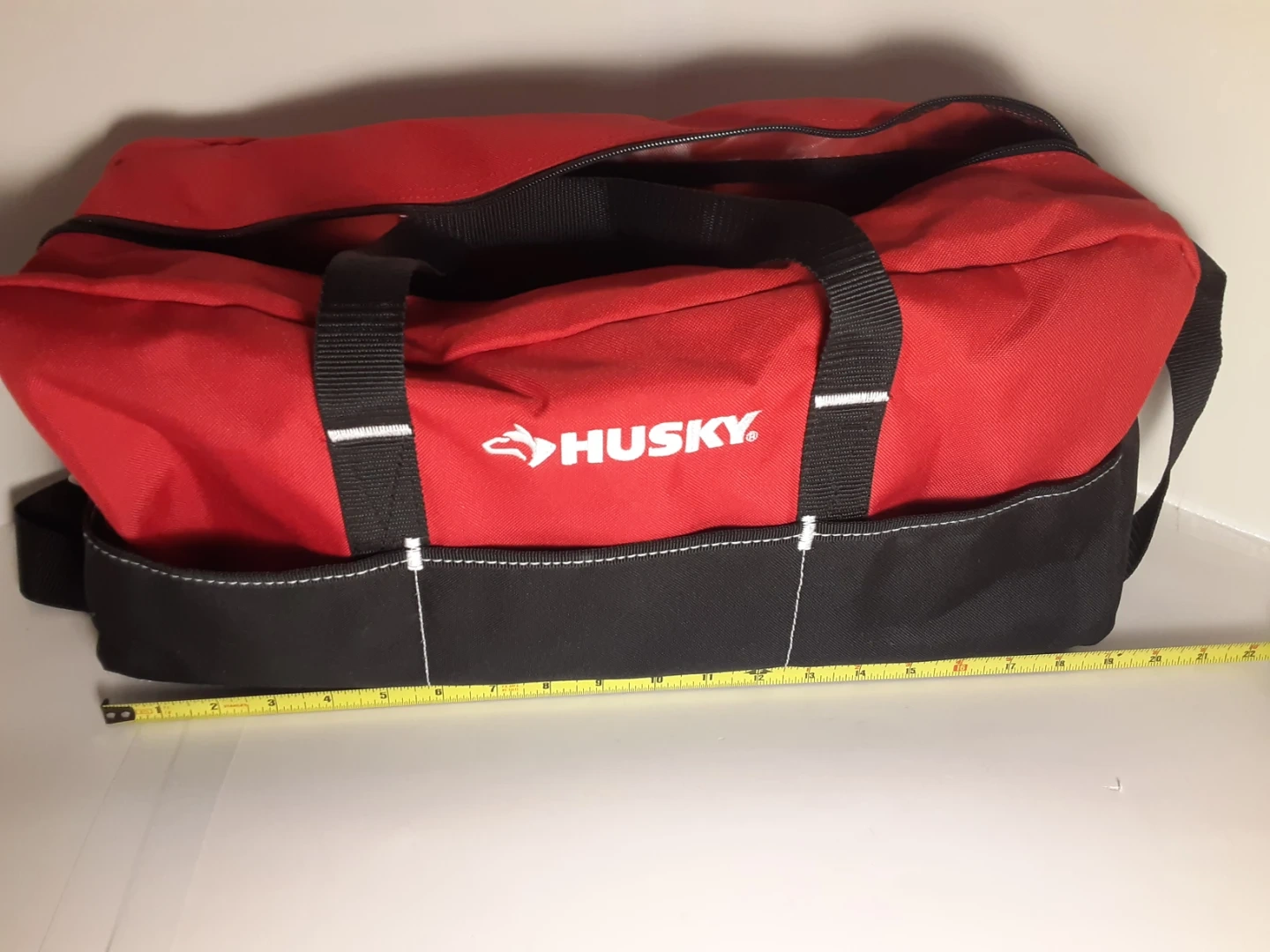 Selling a Husky tool bag in red and black. It's in excellent shape, used very lightly and ready to carry your tools! Features a shoulder strap for easy carrying and many small external side pockets and two internal small/medium side pockets for organization.