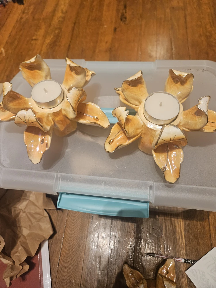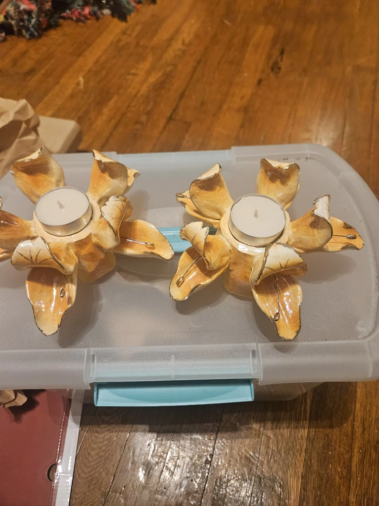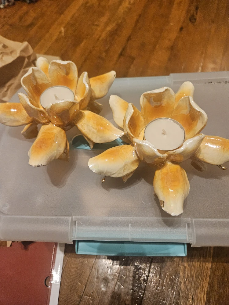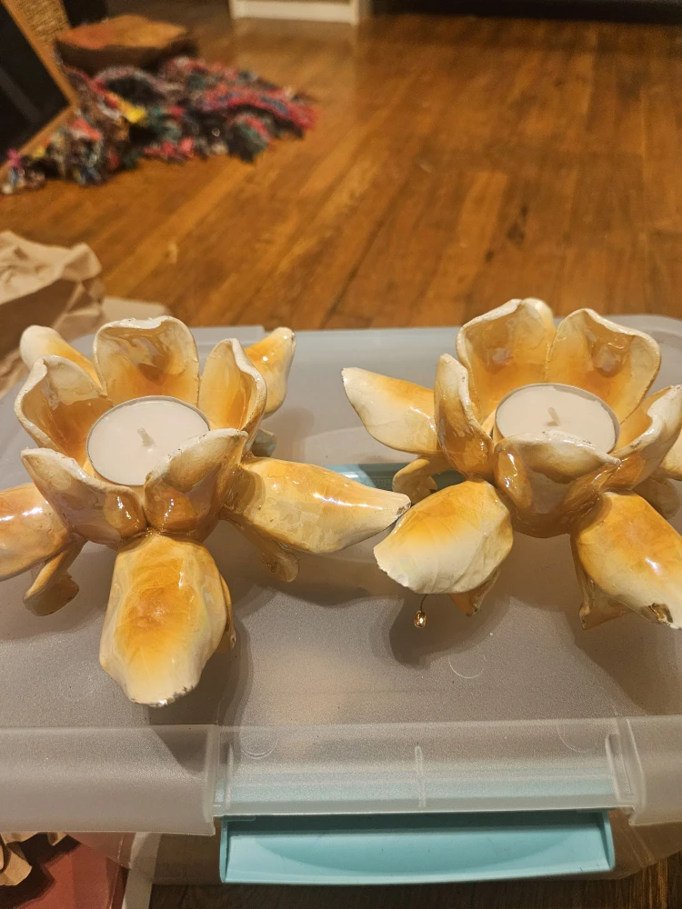 Here's a set of two lotus lusterware flower tea light candle holders. They are a beautiful yellow and white color, perfect for adding a touch of elegance to any room. These candle holders are in great condition and ready to brighten up your space