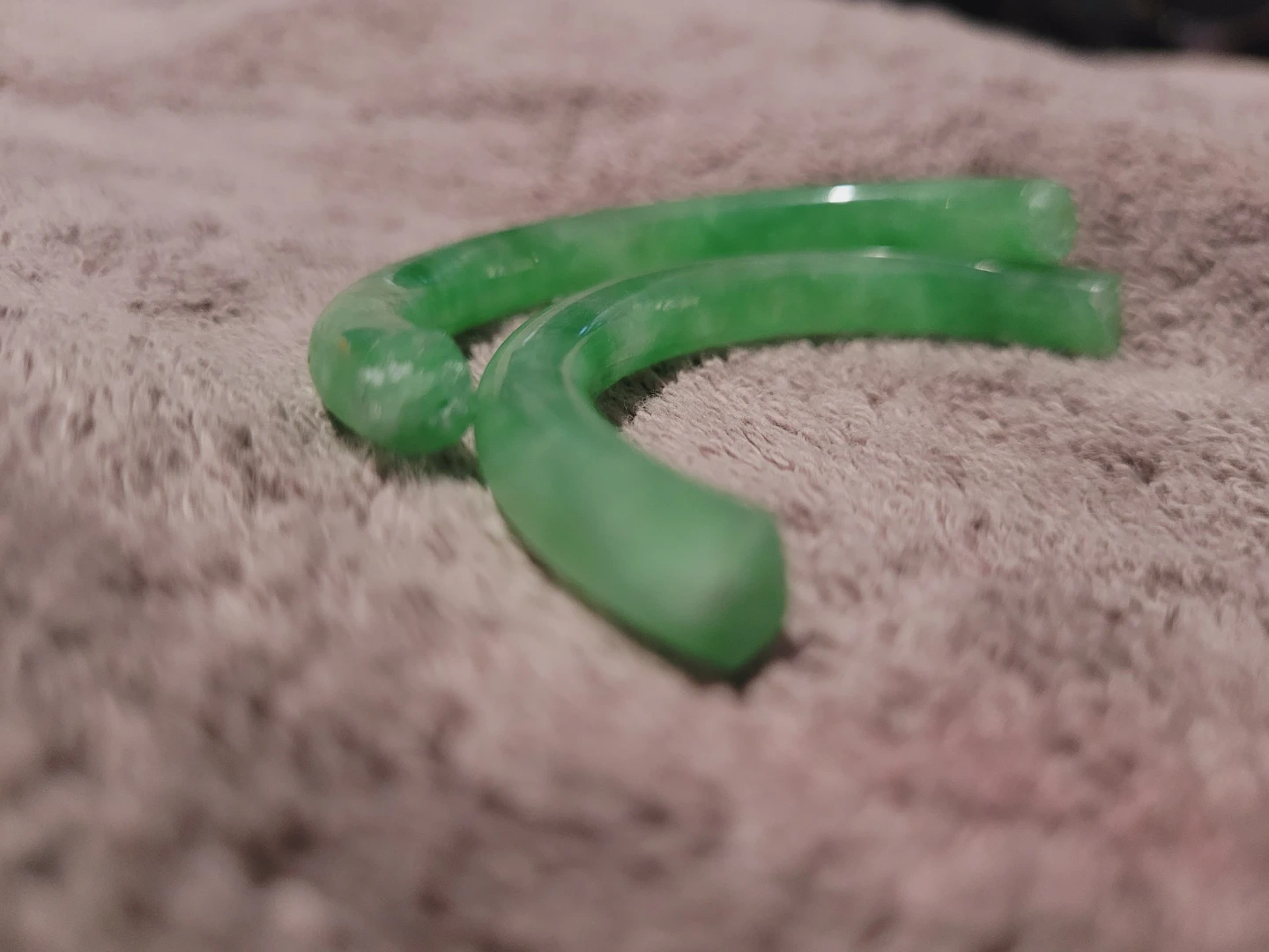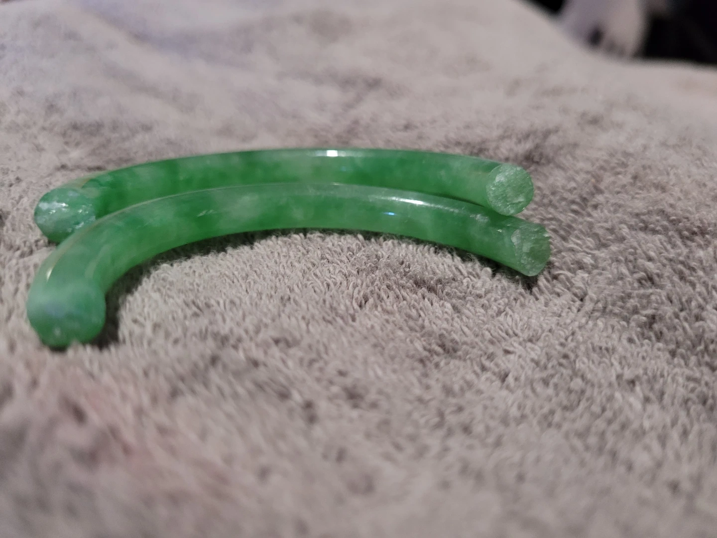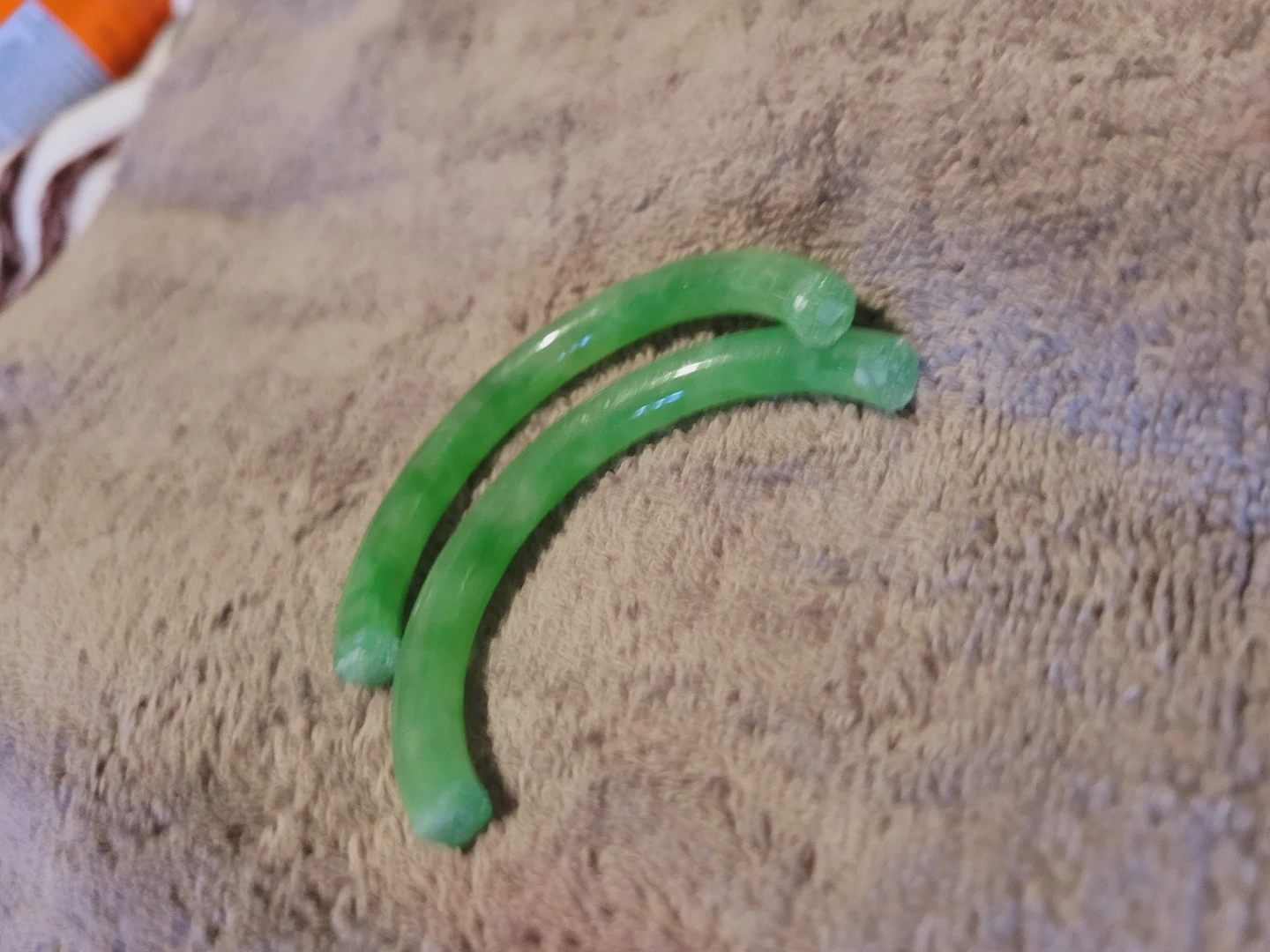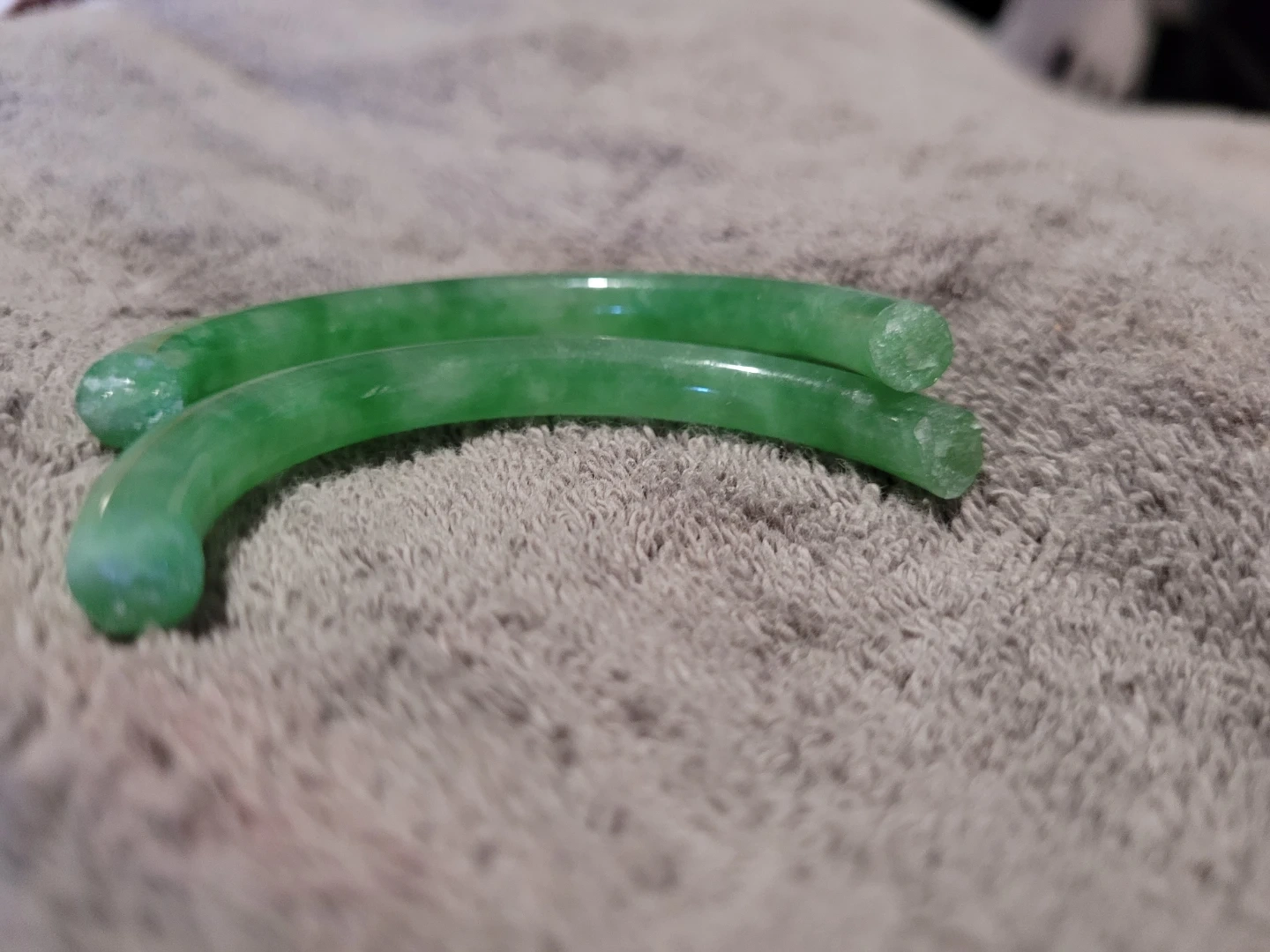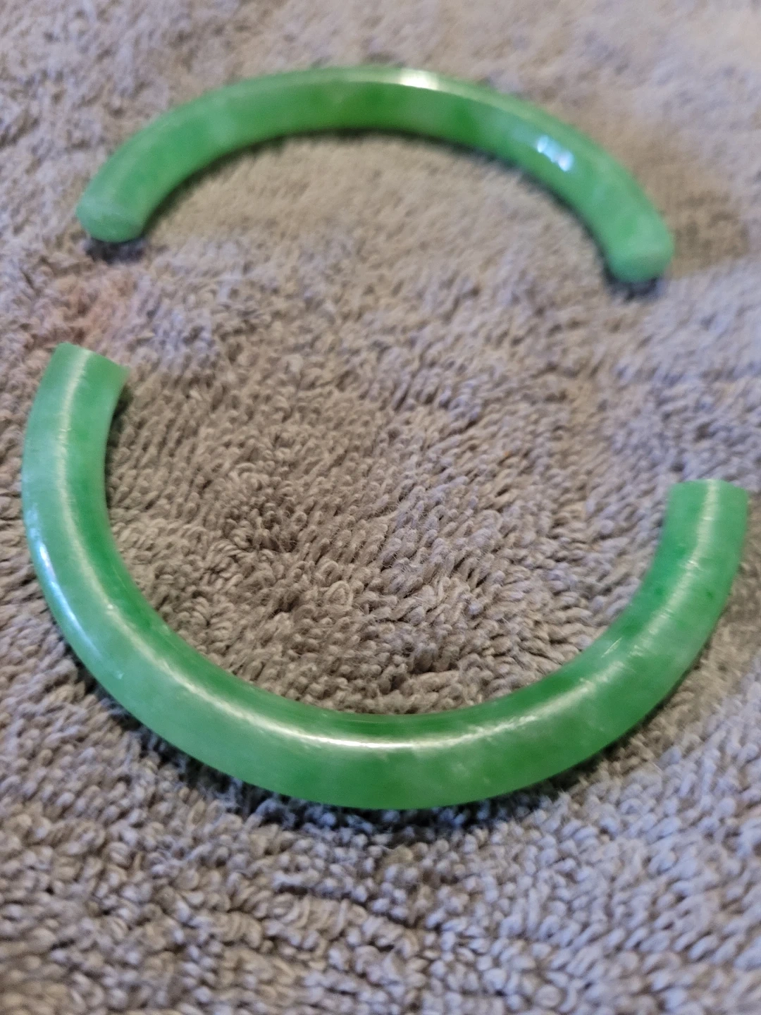 Here are two green jade bangles! They would make a great addition to your jewelry collection. Jeweller told me these are a great to make into a gold capped adjustable easy open bracelet, jadeite is getting to be a rare item and prices have risen alot in the last couple years.