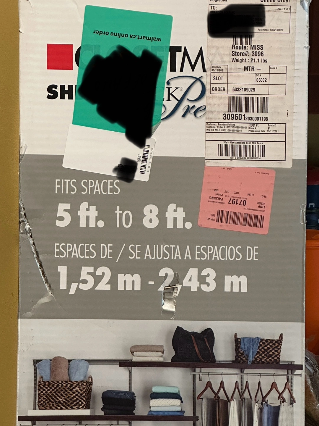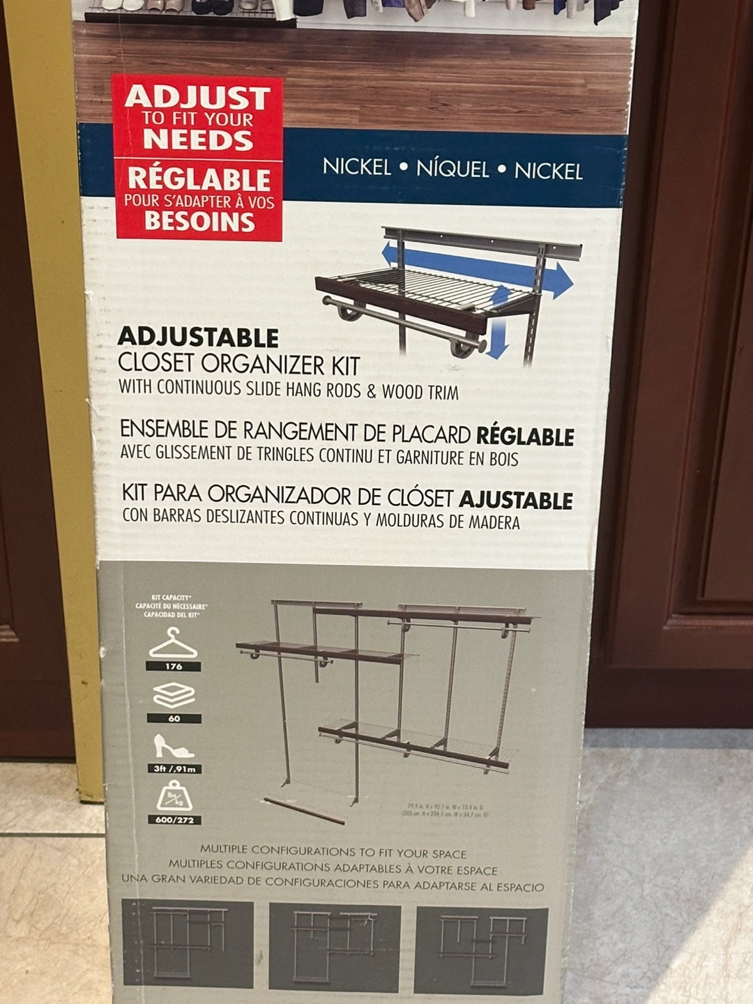 Closet organizer kit. Adjustable design. Includes continuous slide hang rods and wood trim. Multiple configurations. Fits spaces 5ft to 8ft (1.52m - 2.43m). Nickel finish.