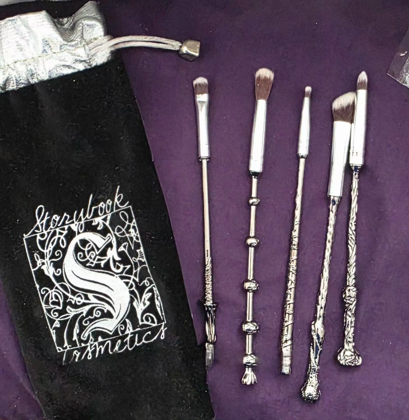 This is a Storybook Cosmetics Harry Potter makeup brush set. It includes five brushes with wand-inspired handles. A black velvet drawstring bag with the Storybook Cosmetics logo is also included.