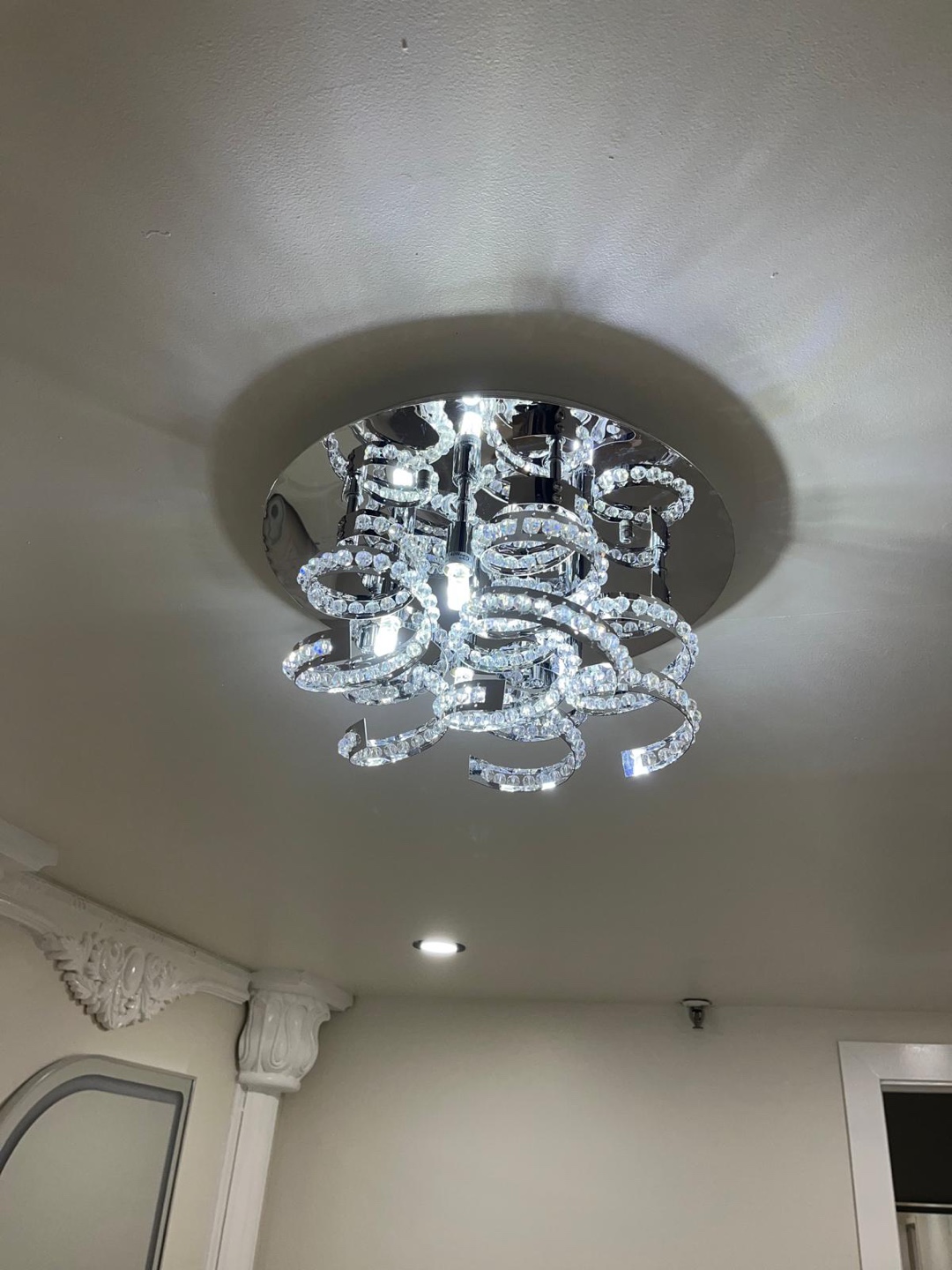 Beautiful modern chandelier with crystal accents and a chrome finish. It's a flush mount design, perfect for adding a touch of sparkle to any room. Brightens up your space with its elegant glow!
