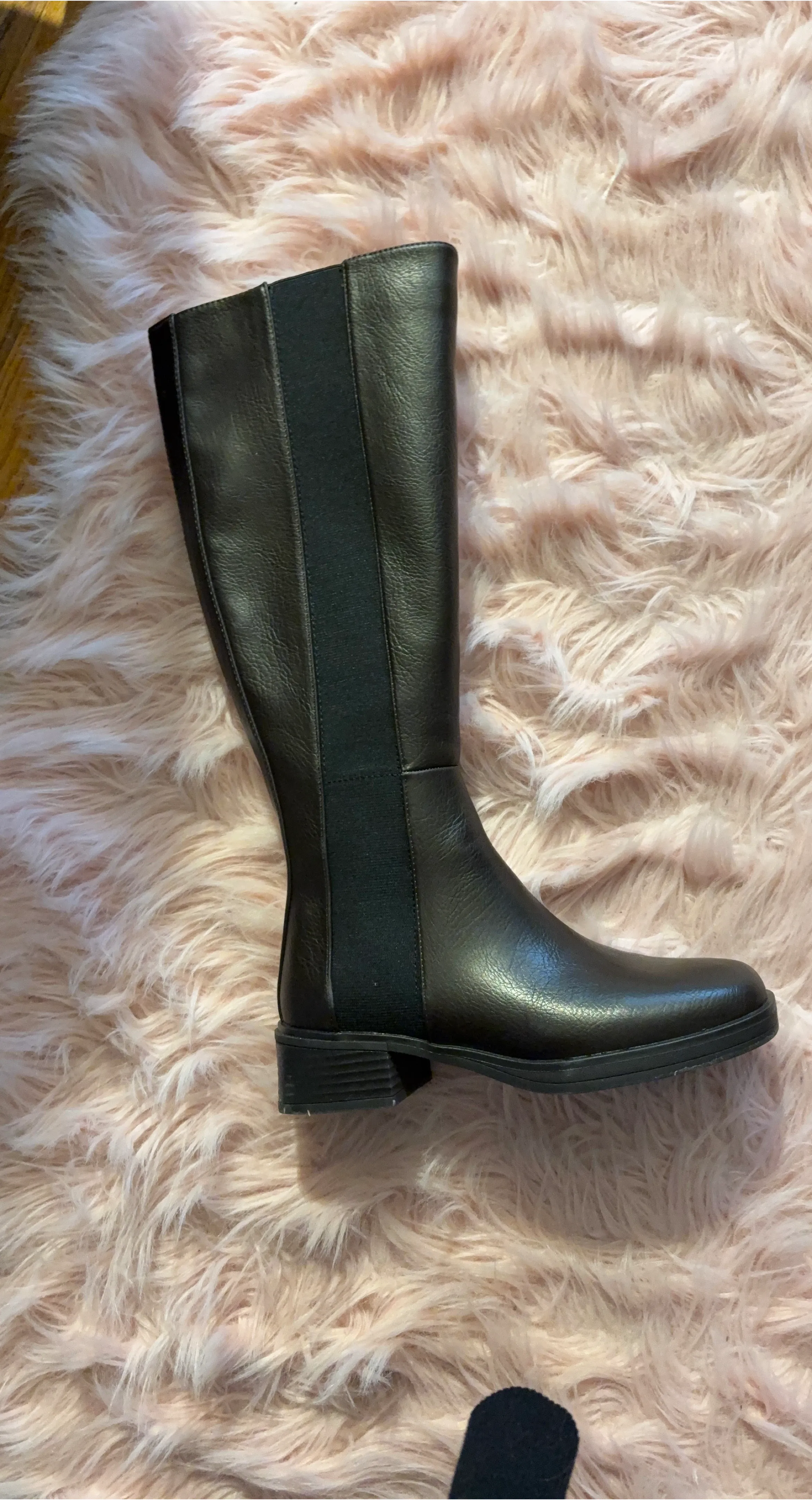 Classic black knee-high boots. Features elastic panels on the sides for a comfortable fit. Genuine leather upper and a low block heel.