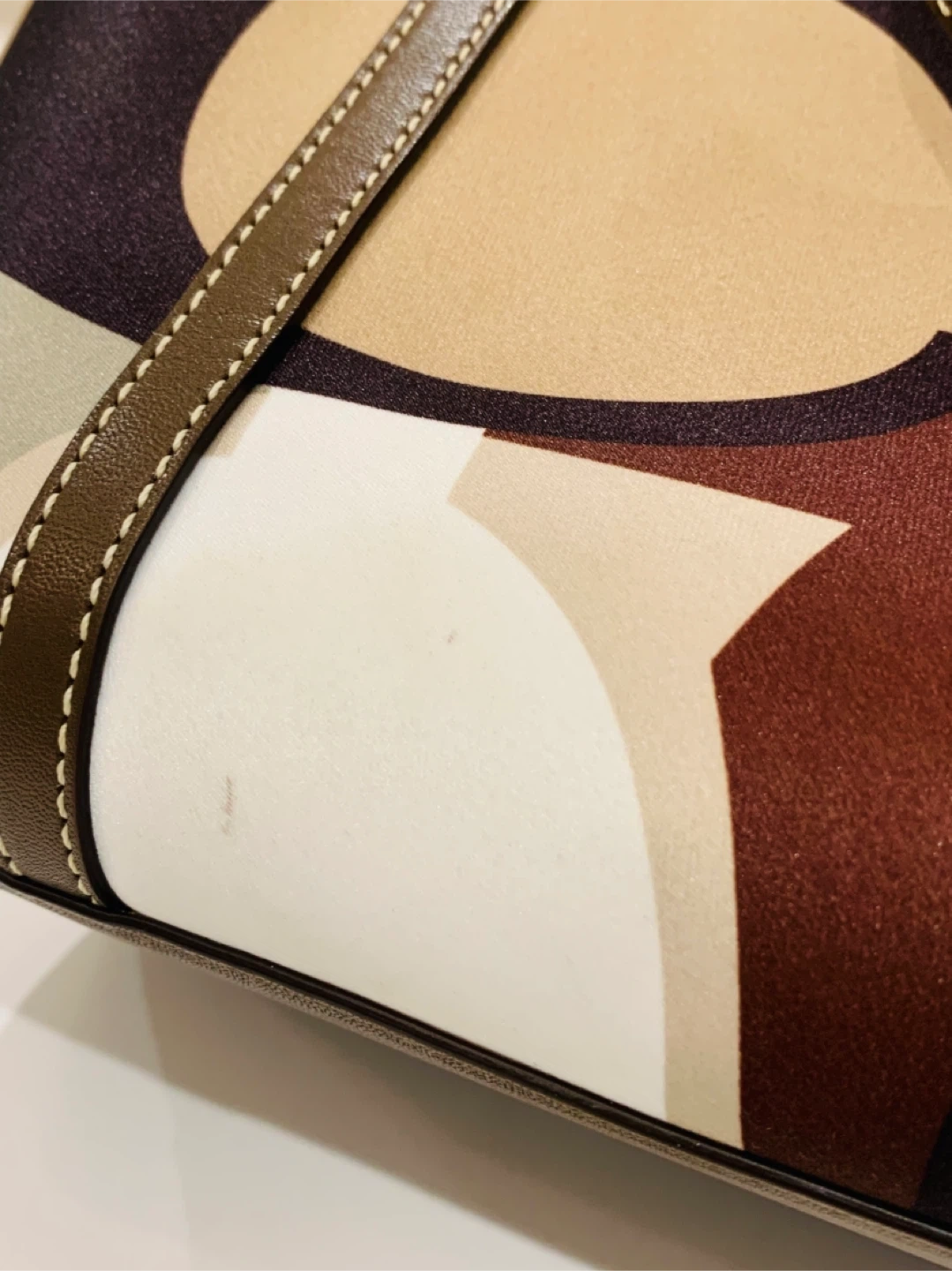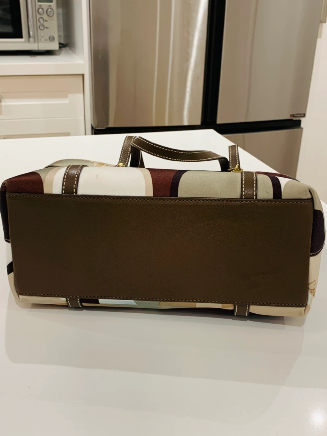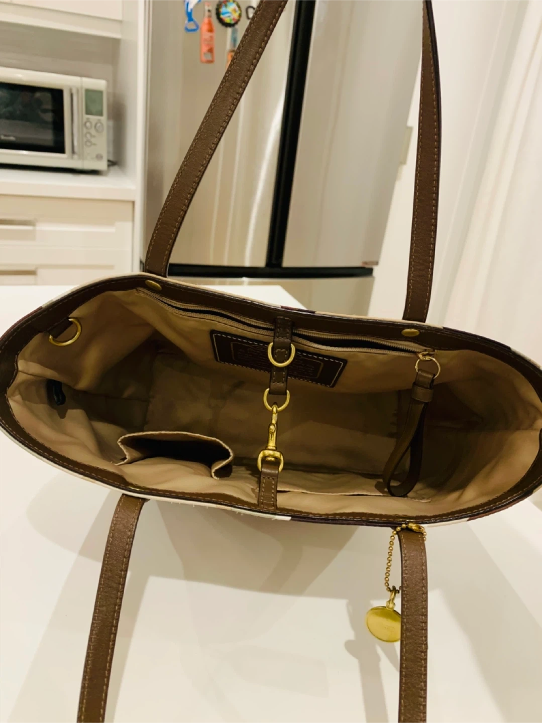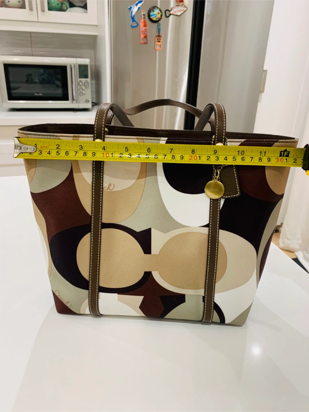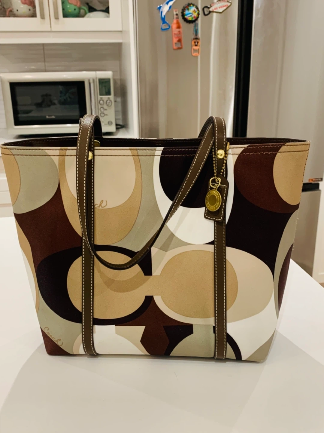 Selling a Coach tote bag with a unique pattern! It has brown leather straps and gold hardware. The bag is in great condition and has lots of space inside.
