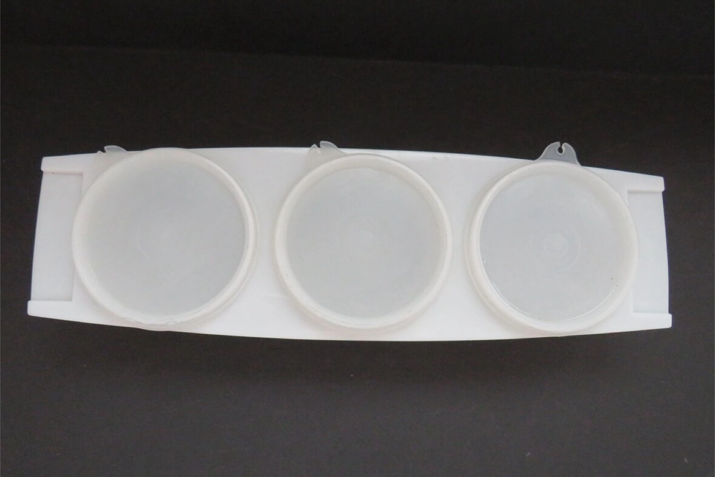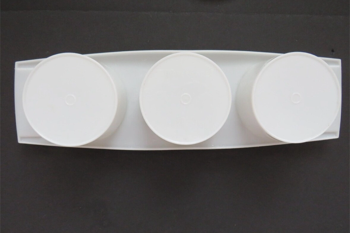 Selling a Tupperware condiment server set! It comes with three white containers and lids, all held together by a tray. Great for serving condiments, dips, or snacks