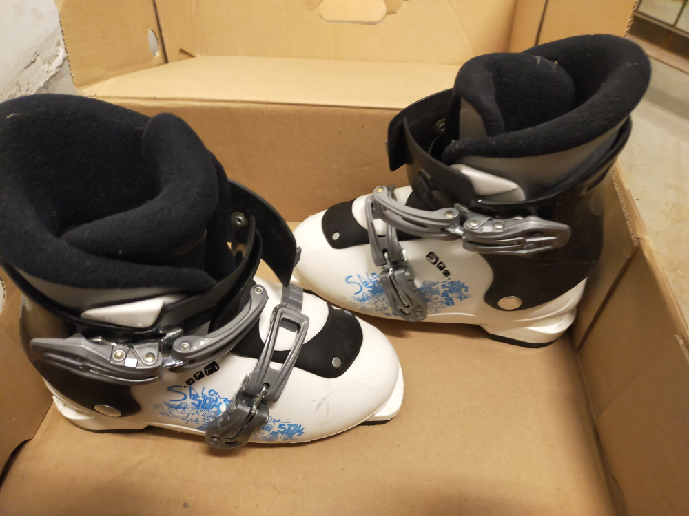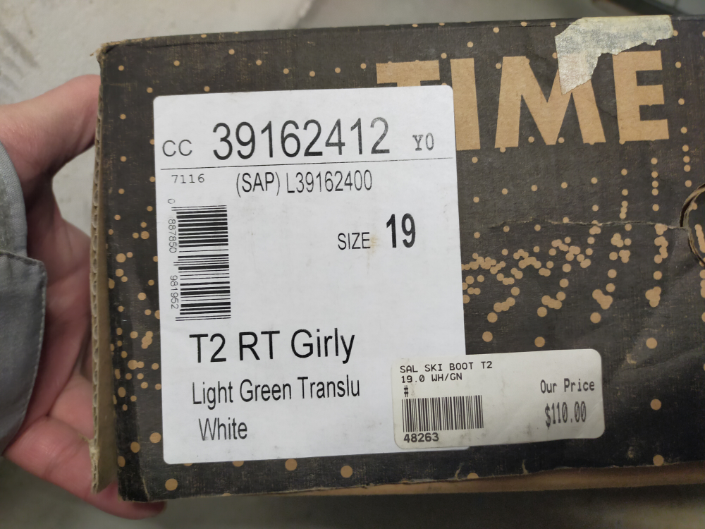 Selling a pair of Salomon T2 RT Girly ski boots in size 19! They come in a light green translucent and white colour. The original price was $110.00. The box is included