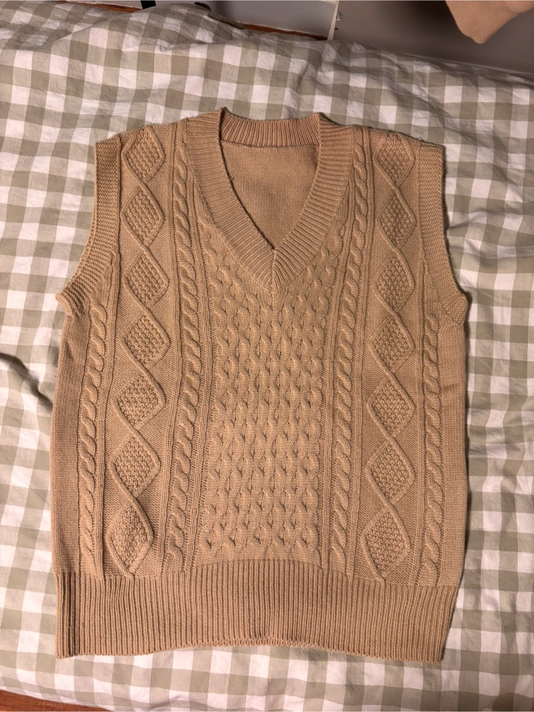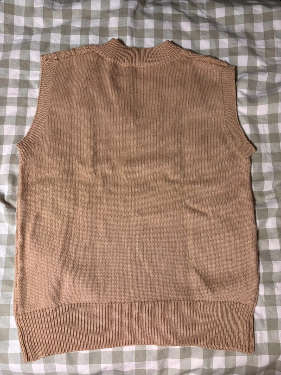 A cozy beige knit vest, perfect for layering! It has a V-neck on one side and a higher neck on the other. It's in great condition and ready for a new wardrobe