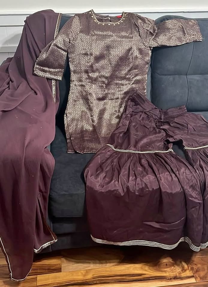 Size small (8), brand W. Wore twice. Wine color. Light but elegant. Perfect for any occasion. It's a 3 piece sharara suit. Pick up near Sandalwood and Kennedy intersection in Brampton.