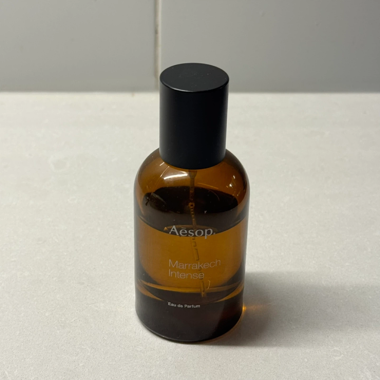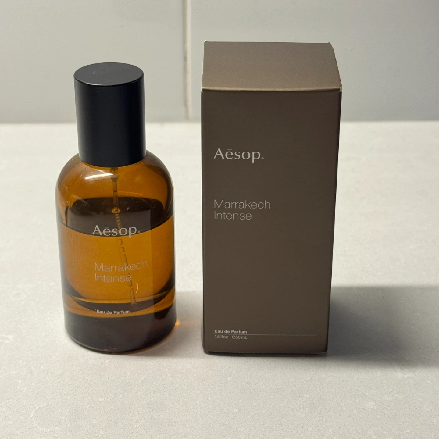 Aesop Marrakech Intense Eau de Parfum. Amber glass bottle with black cap. Includes original box. 1.6 fl oz / 50 mL. About 35ml left