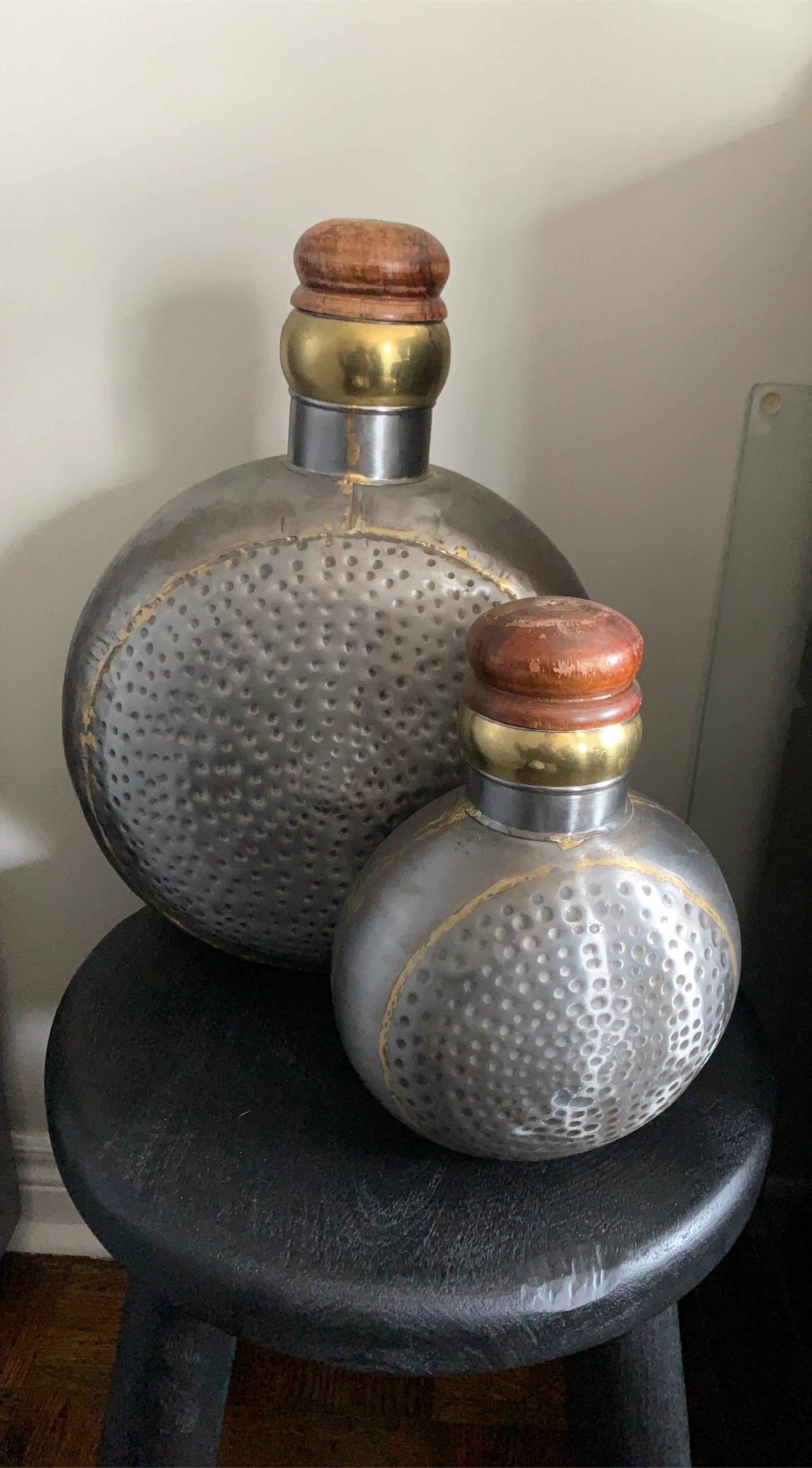 Set of 2 Hammered Metal Decorative Bottles with Wood Lids