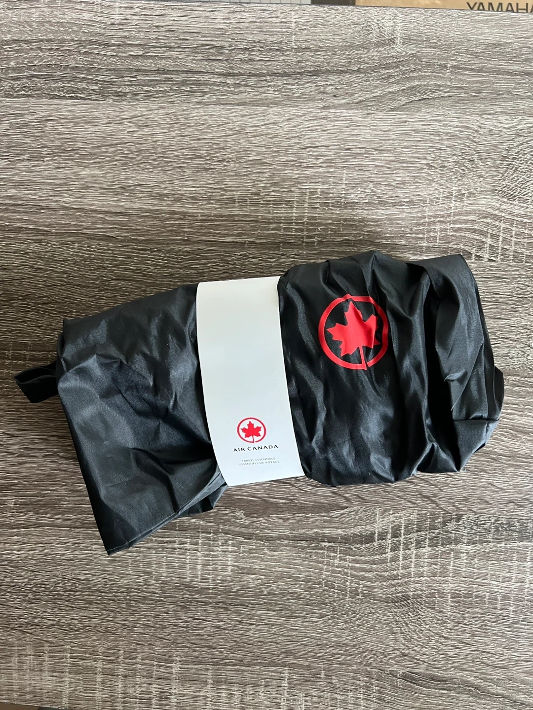 This Air Canada amenity kit includes a reusable bag, Colgate toothpaste, eyeshade, socks, earplugs, and a toothbrush.