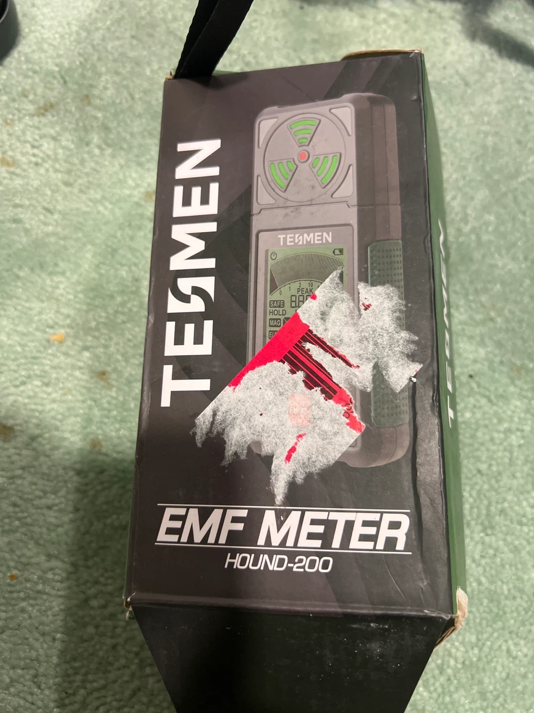 This is a TESMEN HOUND-200 EMF Meter. It comes with a carrying case for protection and portability. This device helps measure electromagnetic fields.