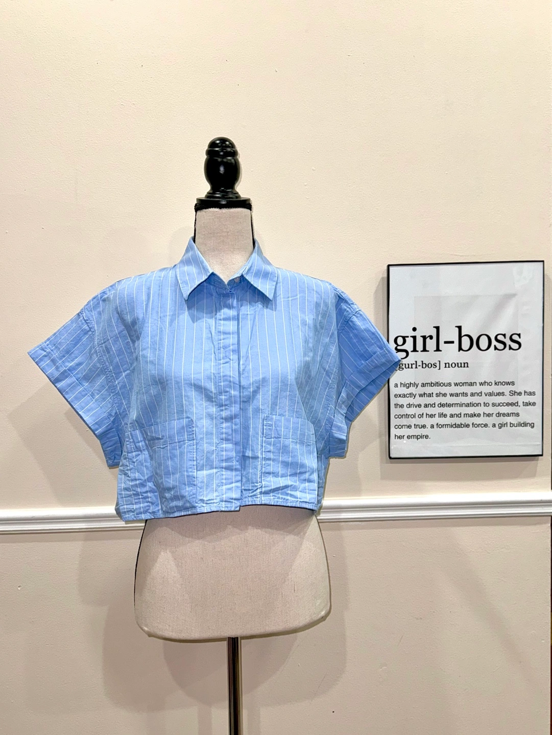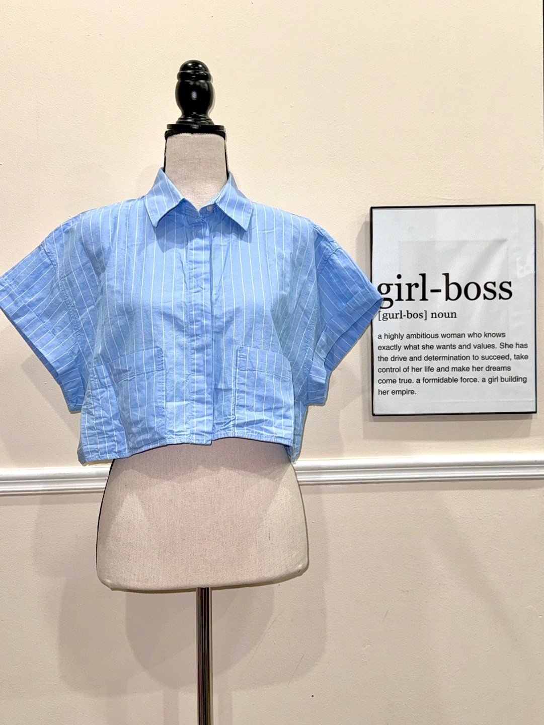 Short sleeve cropped button-up shirt. Blue and white striped pattern.
