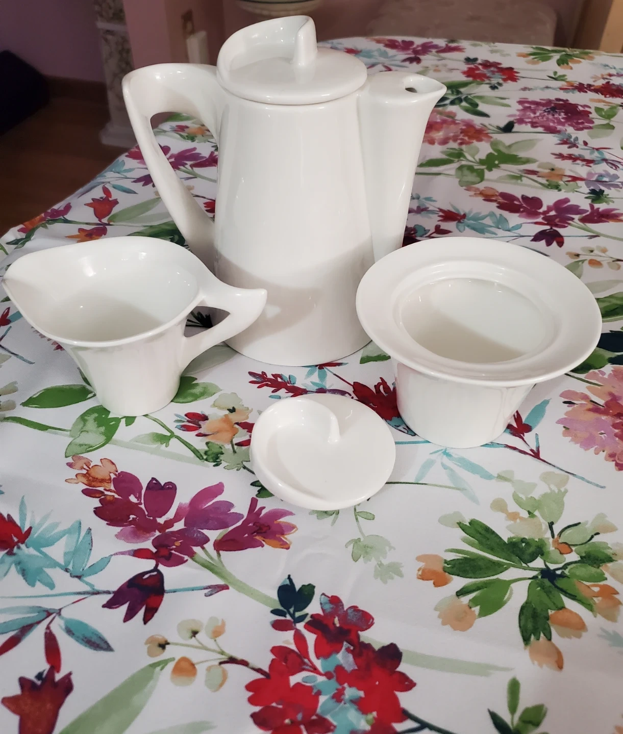 A lovely white porcelain coffee/tea pot set. Includes a coffee pot, a creamer pitcher, and a sugar bowl with a lid. Made of durable porcelain. NEW never used. from Da Vinci collection.
