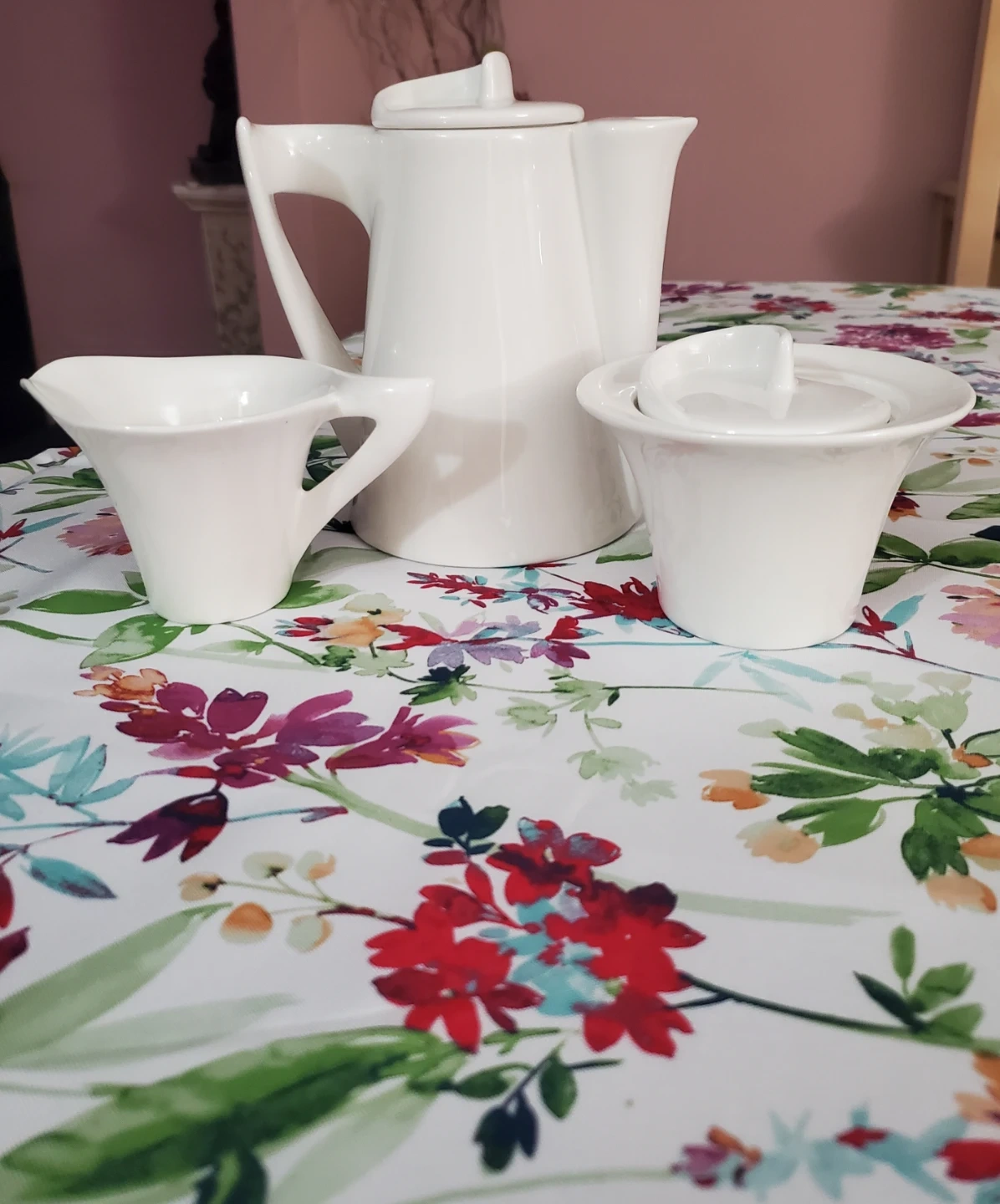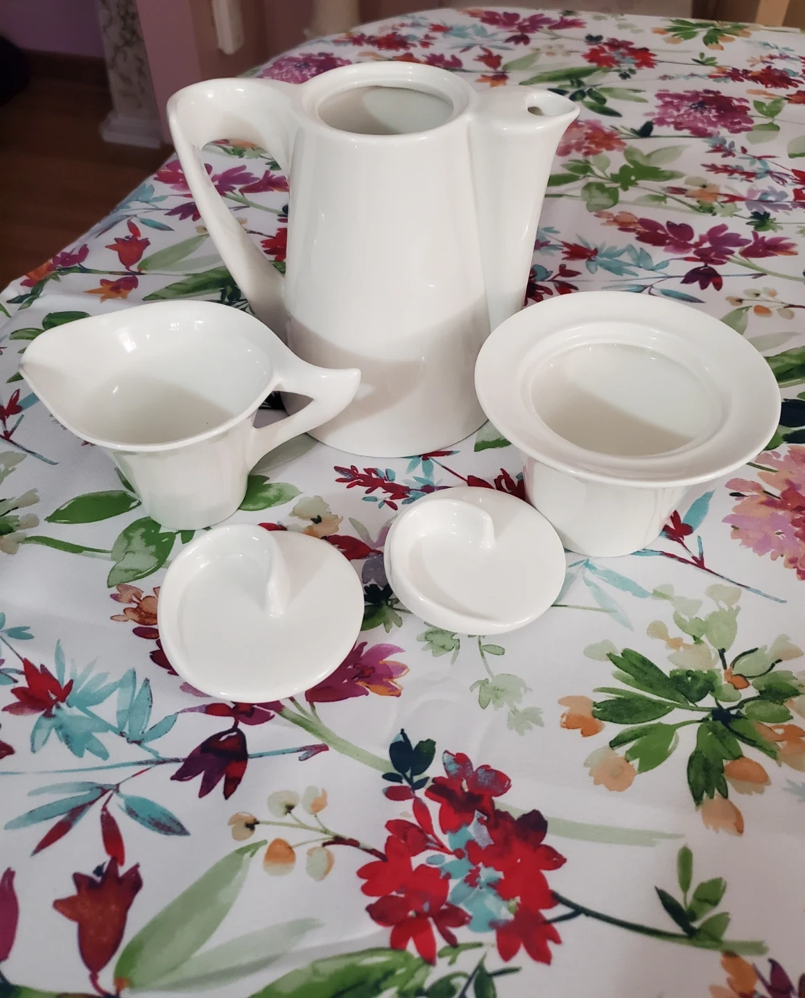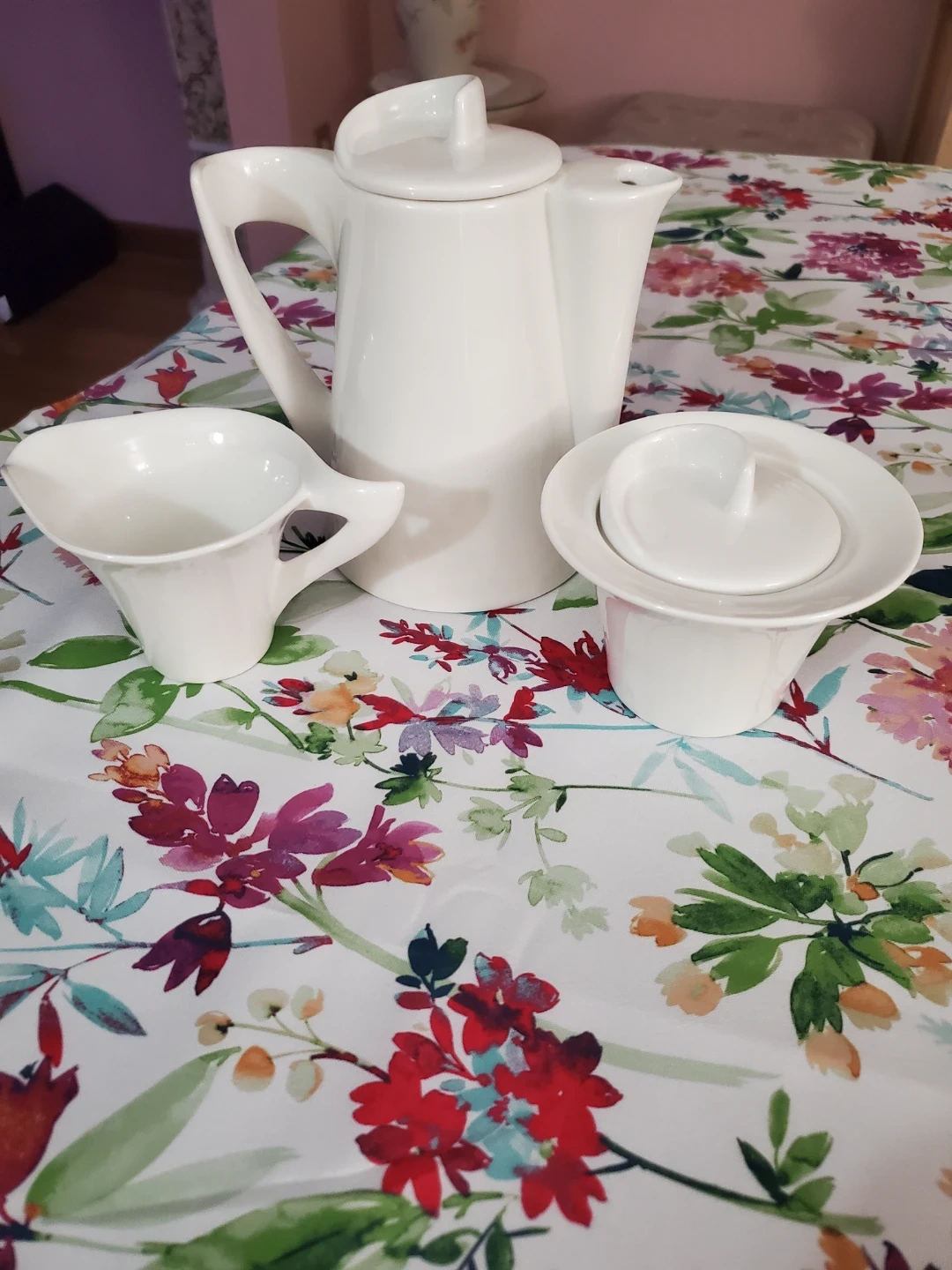 A lovely white porcelain coffee/tea pot set. Includes a coffee pot, a creamer pitcher, and a sugar bowl with a lid. Made of durable porcelain. NEW never used. from Da Vinci collection.