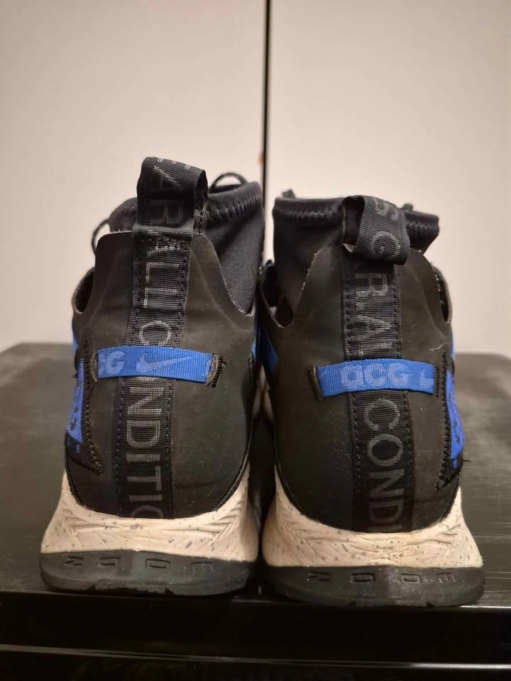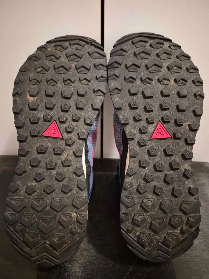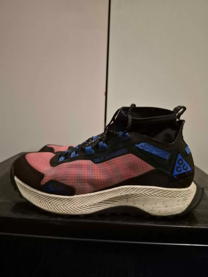 Nike ACG Zoom Terra Zaherra in the "Rush Pink/Racer Blue/Black" colorway. High-top athletic shoes designed for outdoor activities like hiking and trail running, featuring water-repellent bootie construction and a durable rubber outsole with high-traction lugs. Men's size 11, used in good condition. Soles are still good, only problem is one of the shoelace eyelets has ripped (shown in pictures).