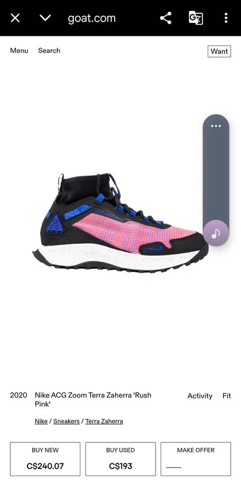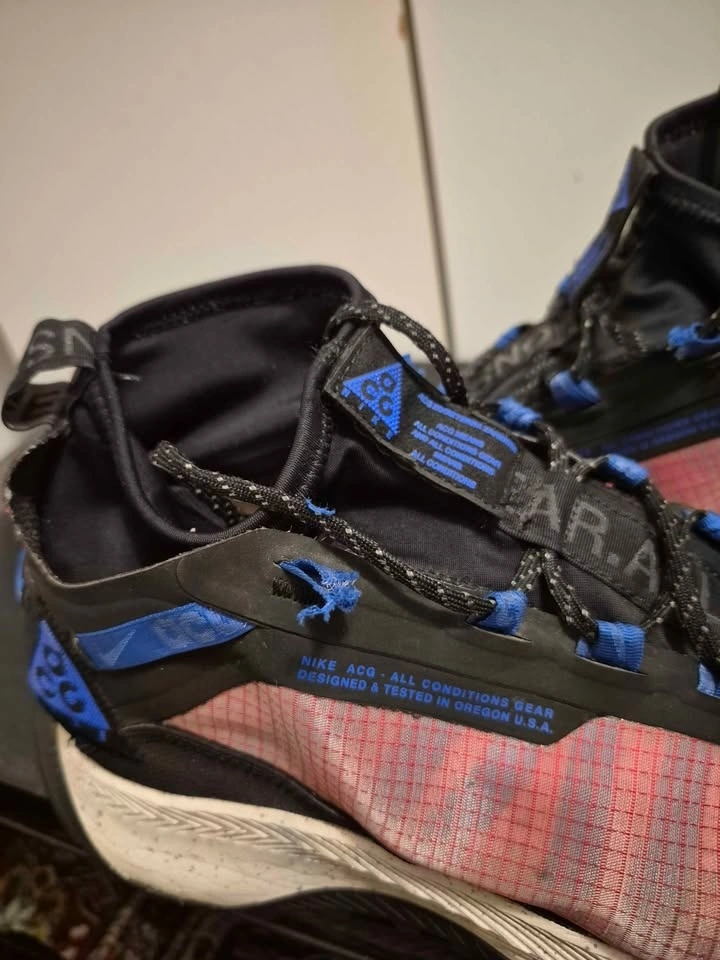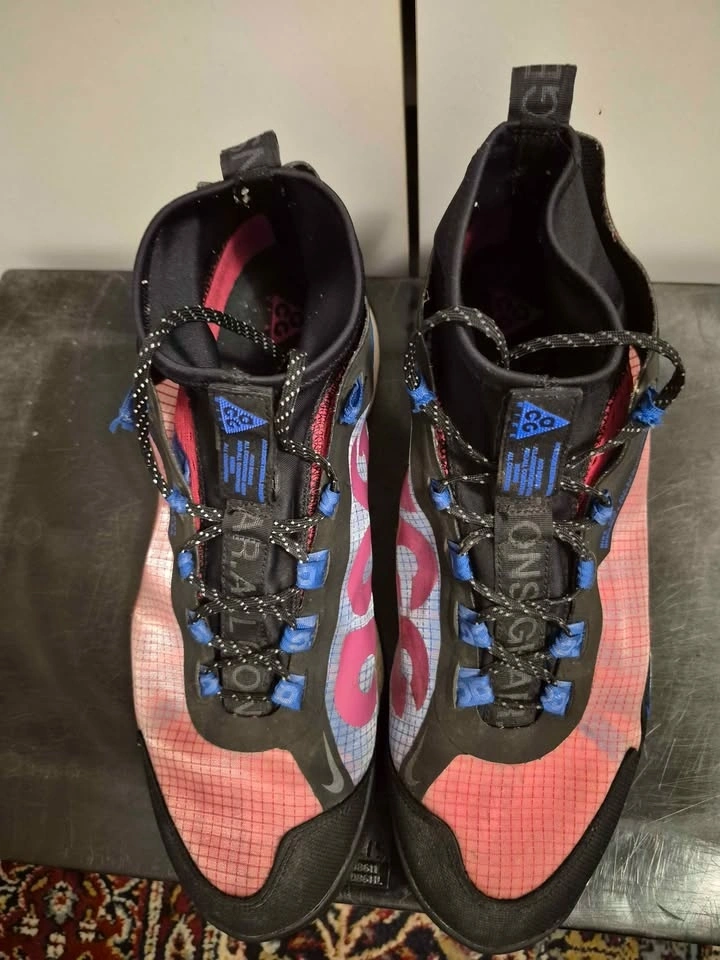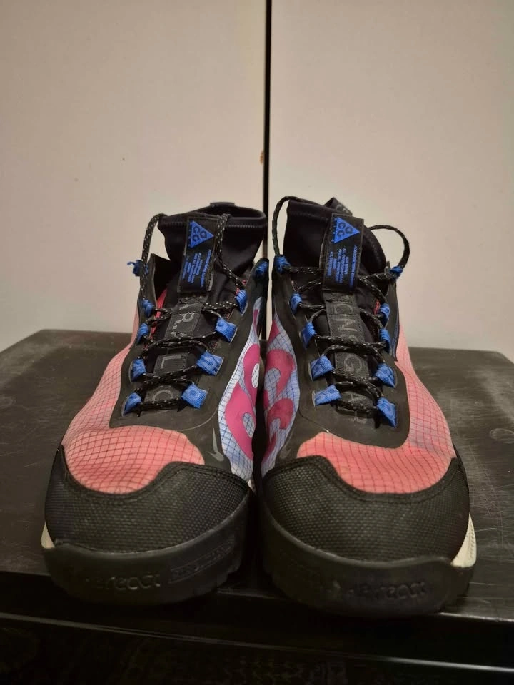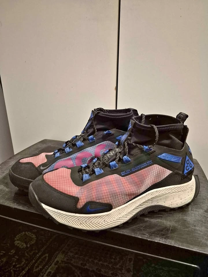 Nike ACG Zoom Terra Zaherra in the "Rush Pink/Racer Blue/Black" colorway. High-top athletic shoes designed for outdoor activities like hiking and trail running, featuring water-repellent bootie construction and a durable rubber outsole with high-traction lugs. Men's size 11, used in good condition. Soles are still good, only problem is one of the shoelace eyelets has ripped (shown in pictures).