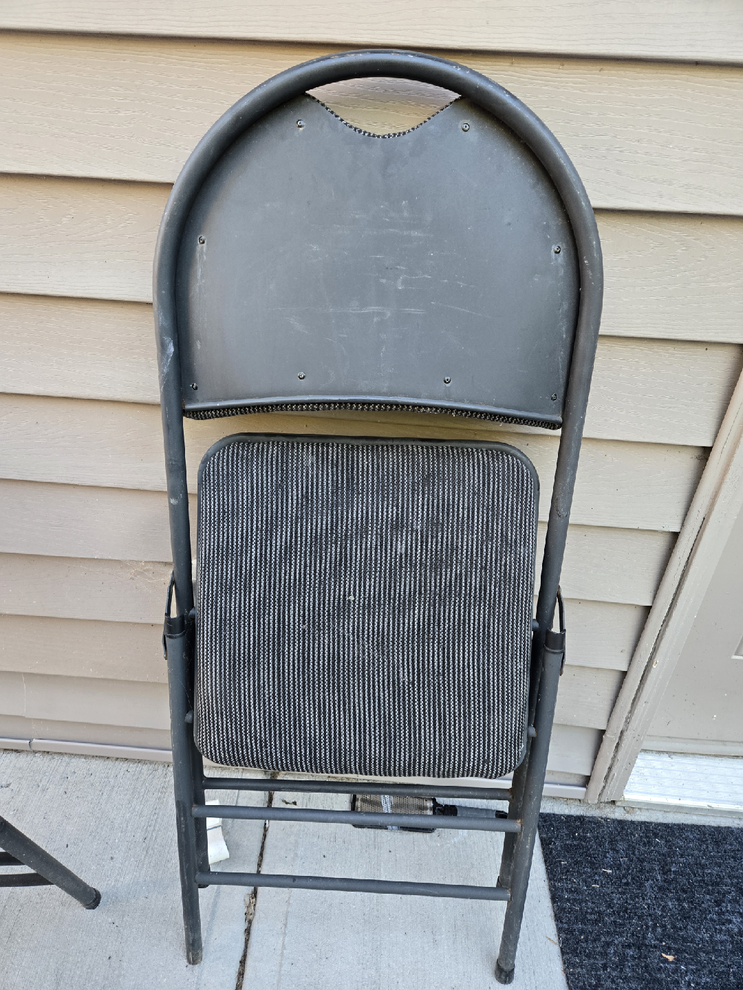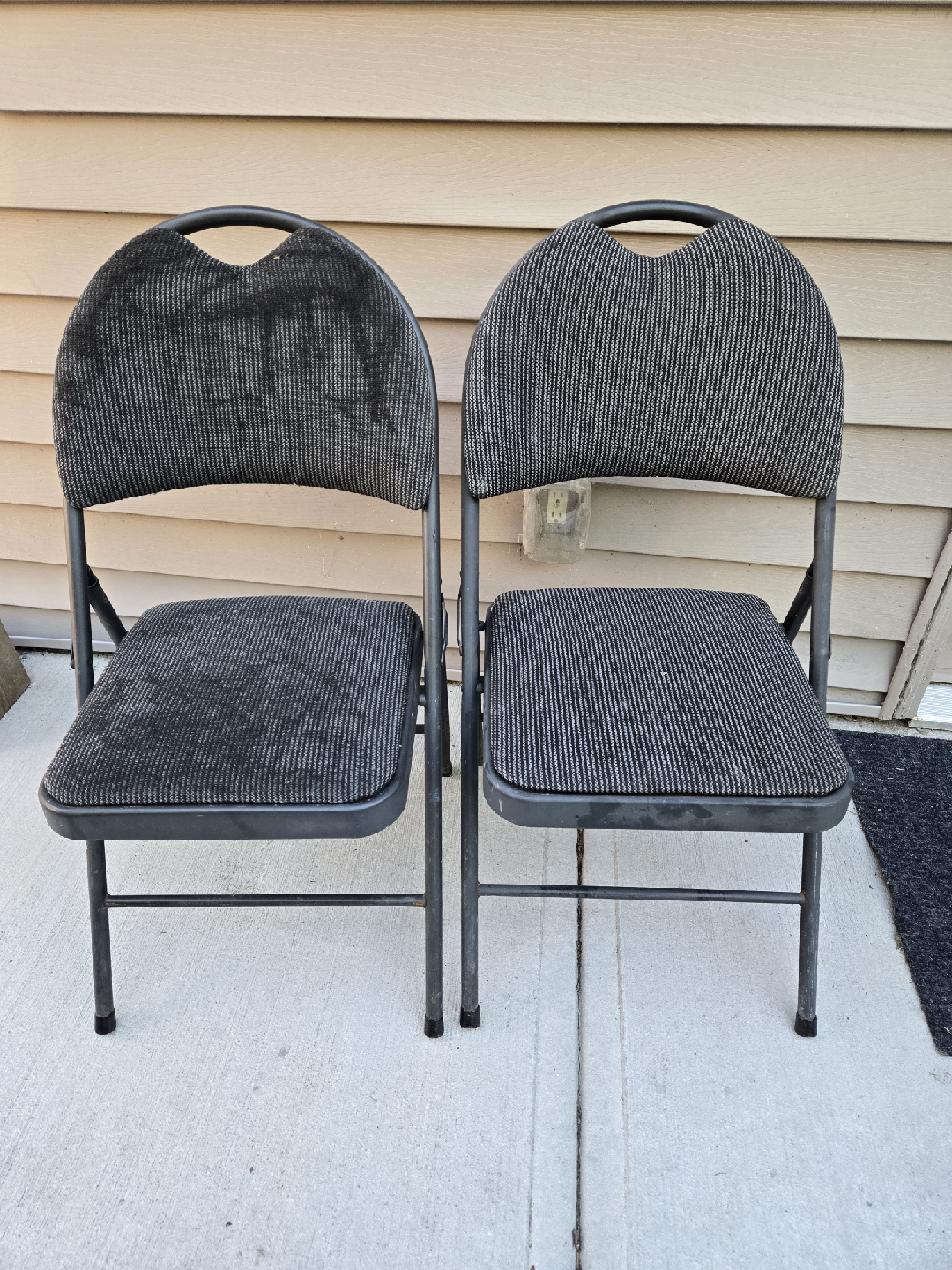 Selling a set of two folding chairs.25 dollars each . They're in good condition and perfect for extra seating when you have guests over. The chairs have a padded seat and back for comfort.