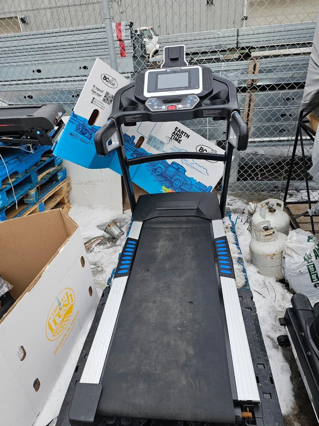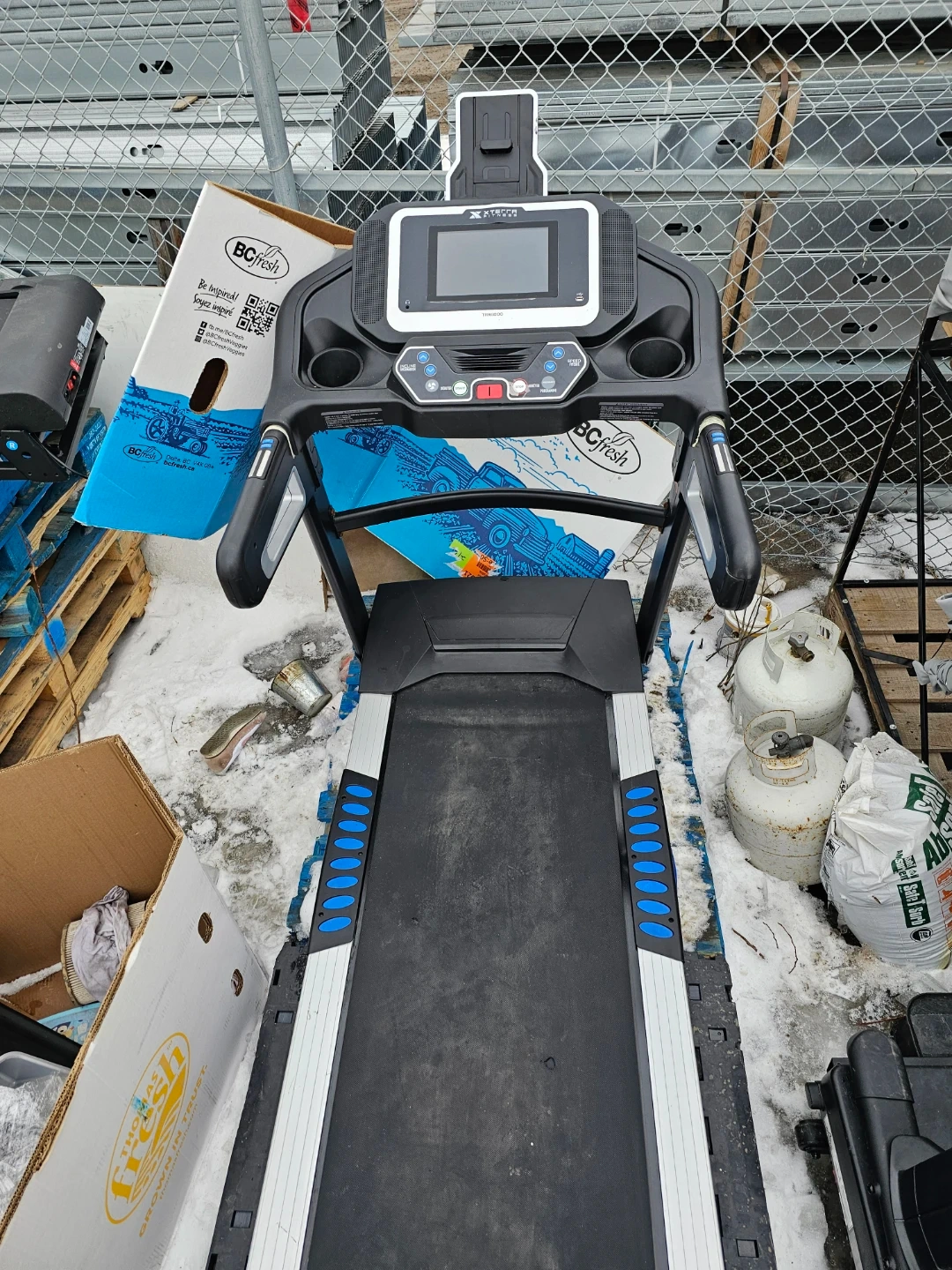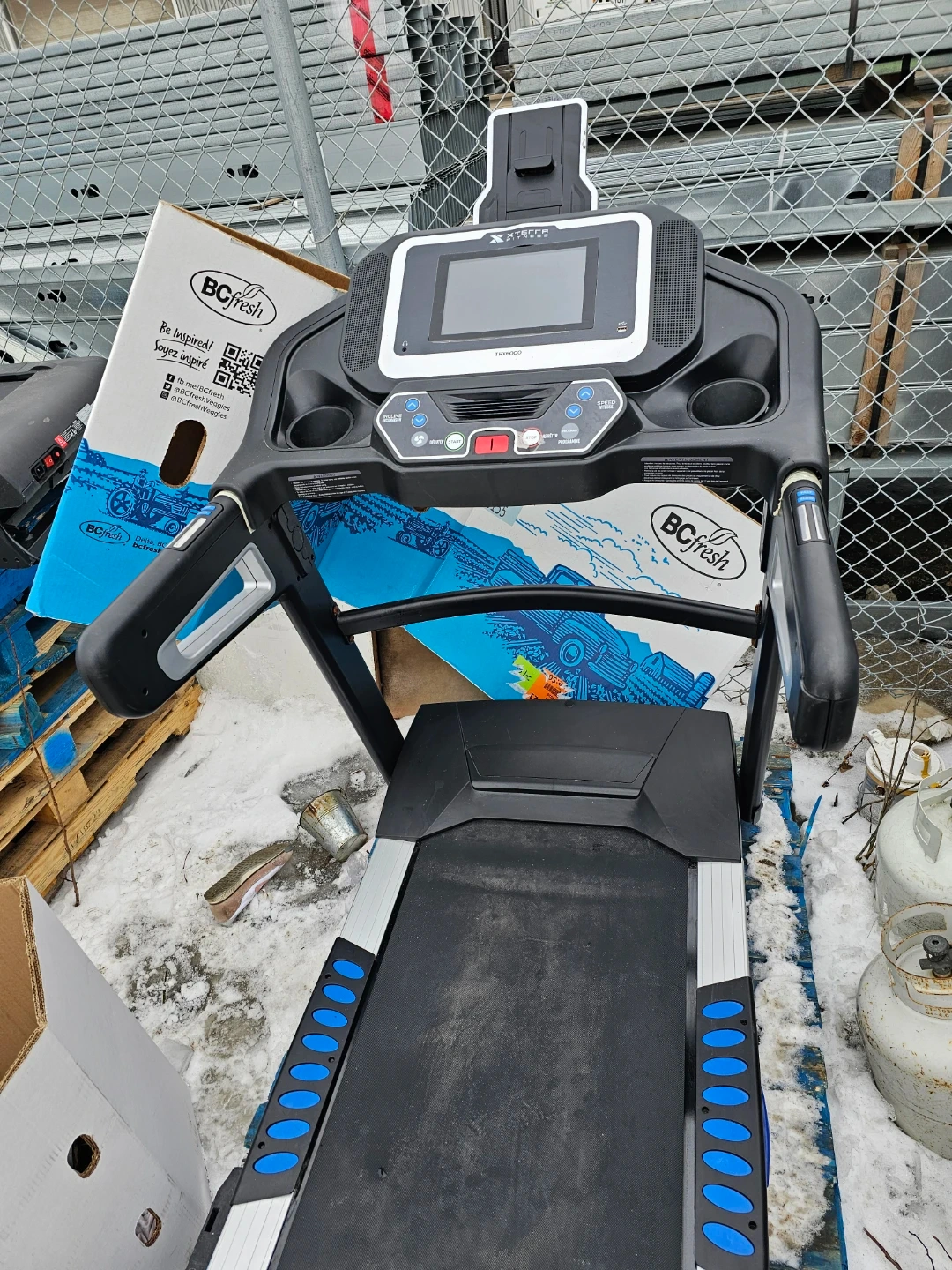 This XTERRA treadmill has a running surface with blue accents. It features a digital display with controls for speed and incline. It's great for home workouts!